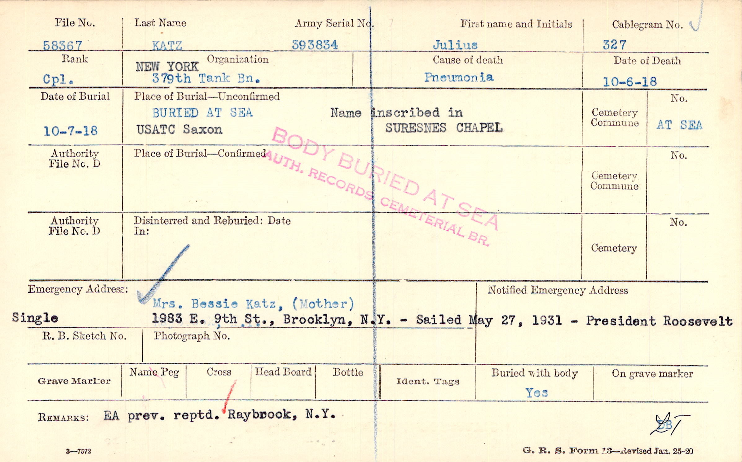BURIED AT SEA , USATC Saxon, Name inscribed in SURESNES CHAPEL