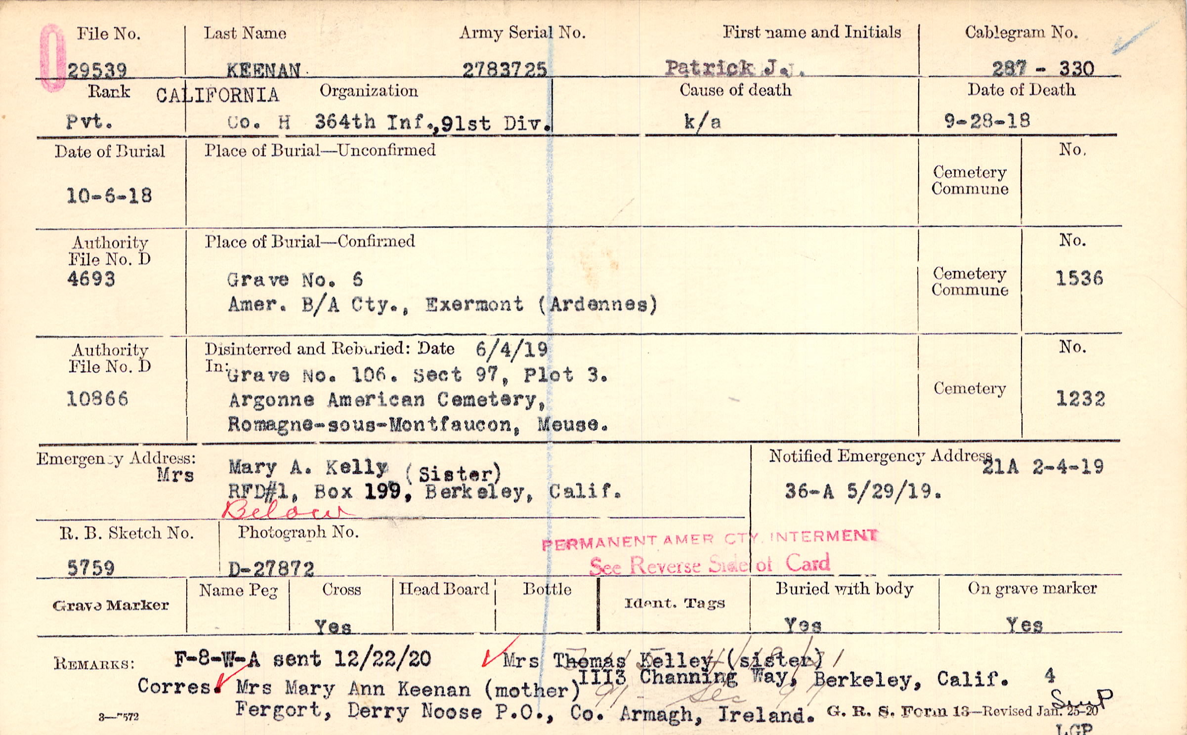 Mrs Mary A. Kelly (Sister), RFD #1 box 199, Berkeley, Calif., Below