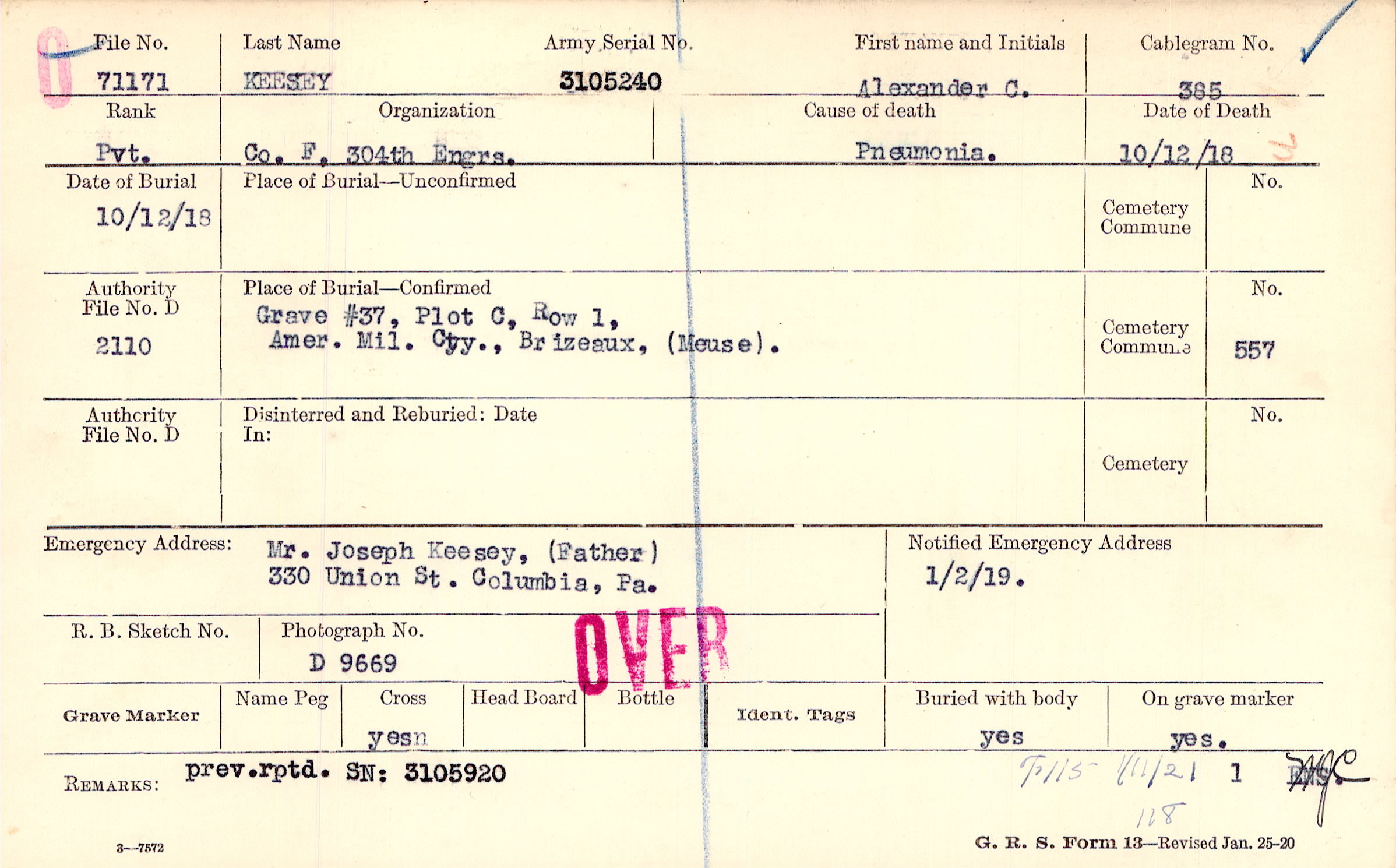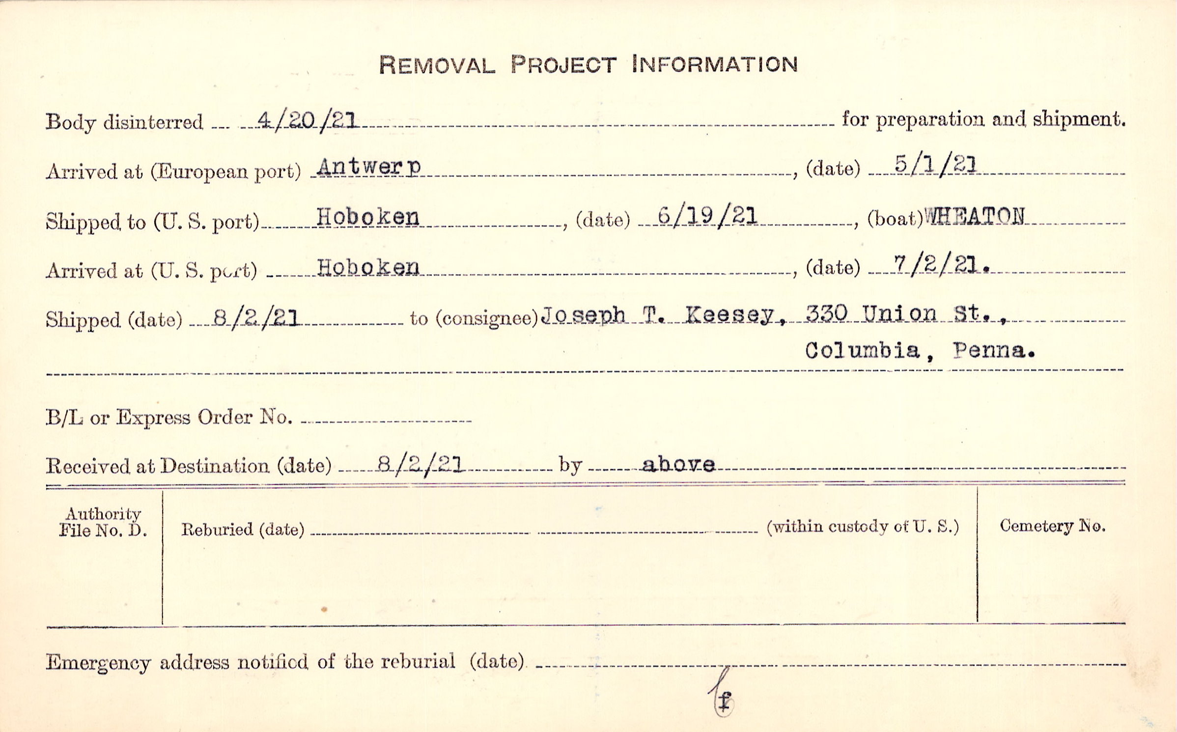 Mr. Joseph Keesey, (Father), 330 Union St. Columbia, Pa.