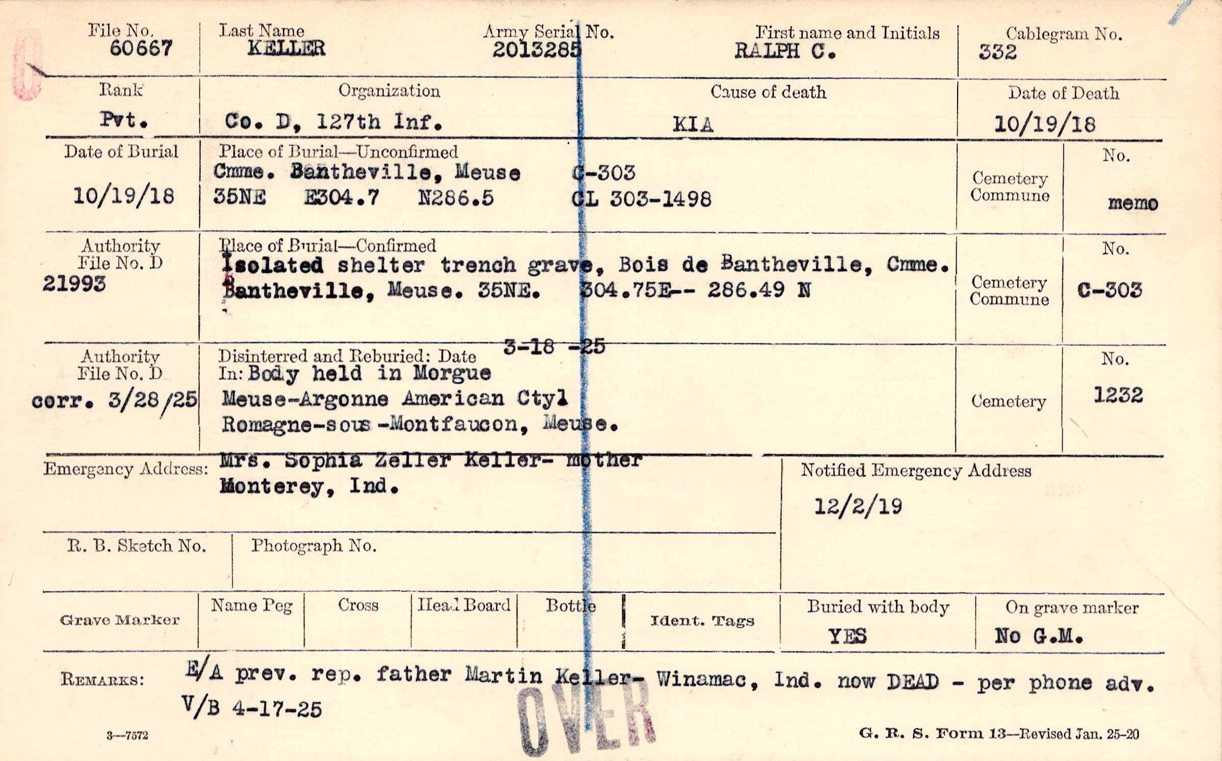 E/A prev. rep. father Martin Keller - Winamac, Ind. now DEAD - per phone adv. V/B 4-17-25