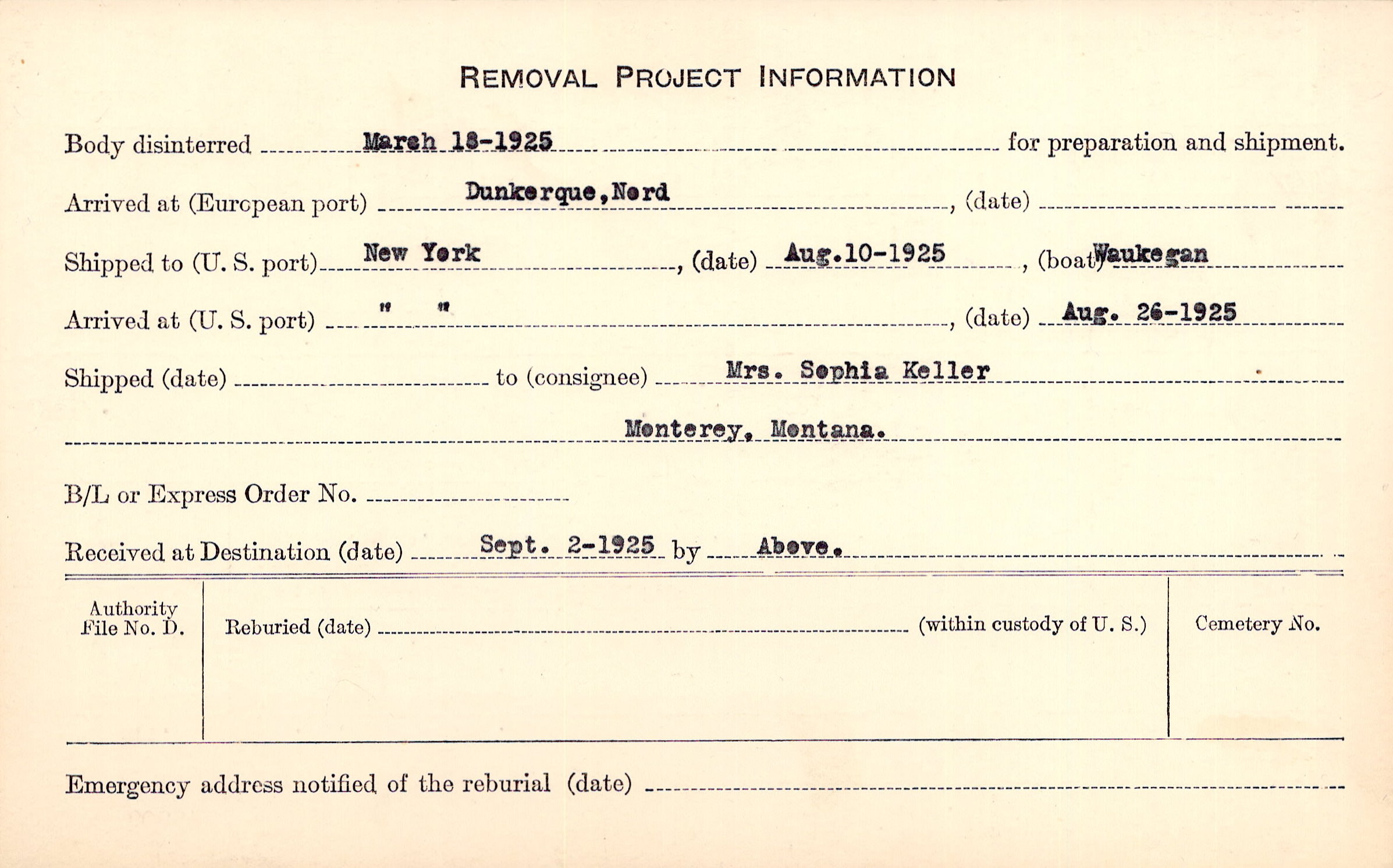 Body disinterred 3/18/1925 for preparation and shipment.