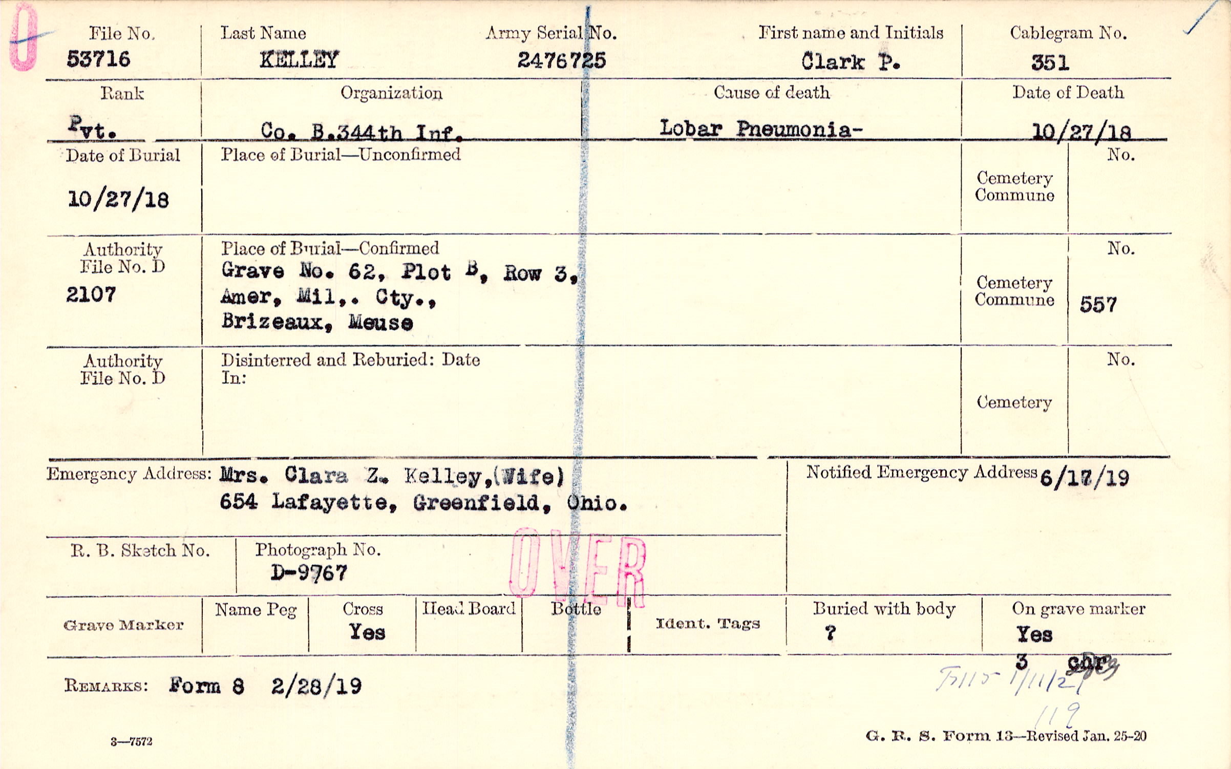 Mrs. Clara Z. Kelley, (Wife), 654 Lafayette, Greenfield, Ohio.