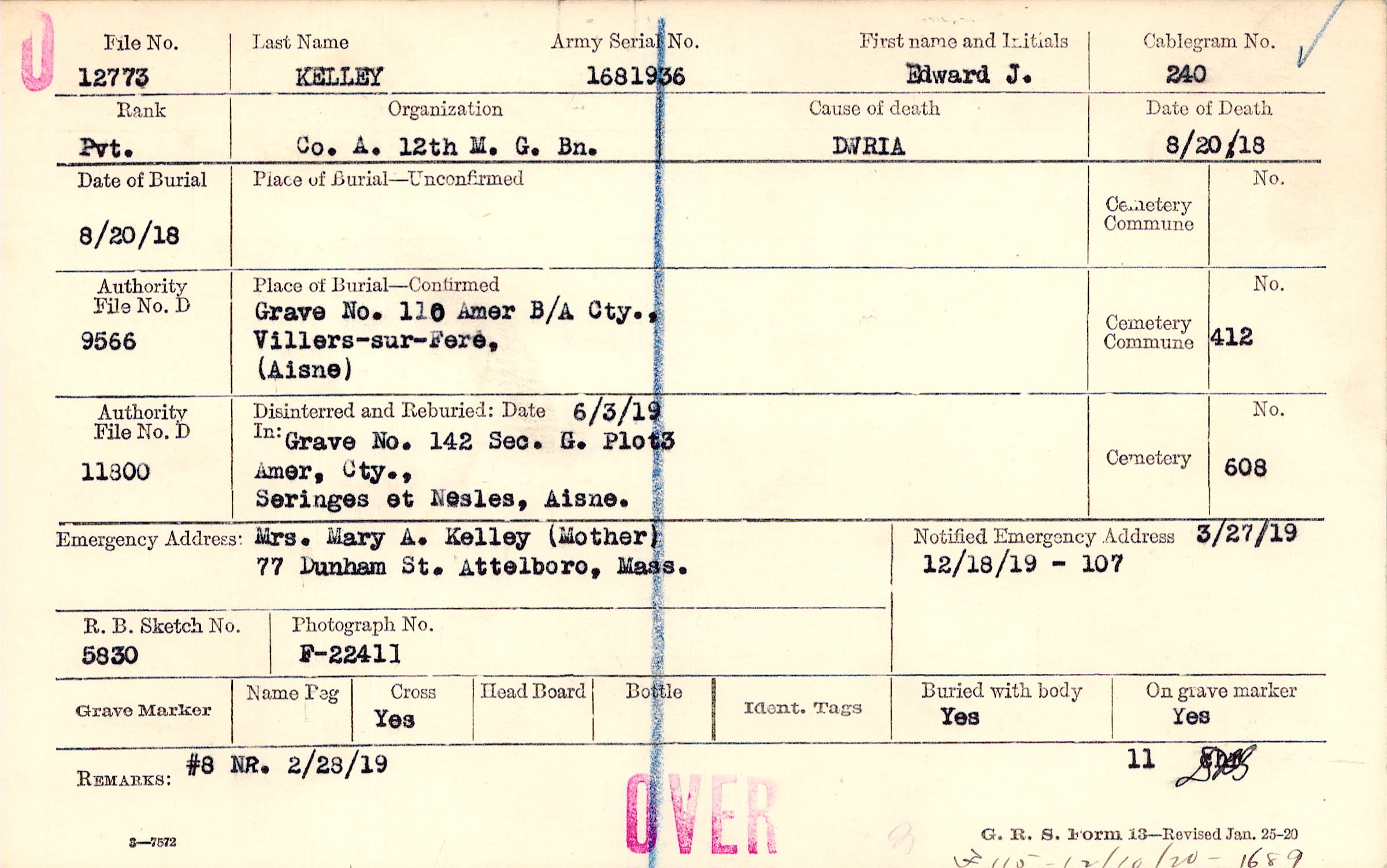 Mrs. Mary A. Kelley (Mother), 77 Dunham St. Attelboro, Mass.