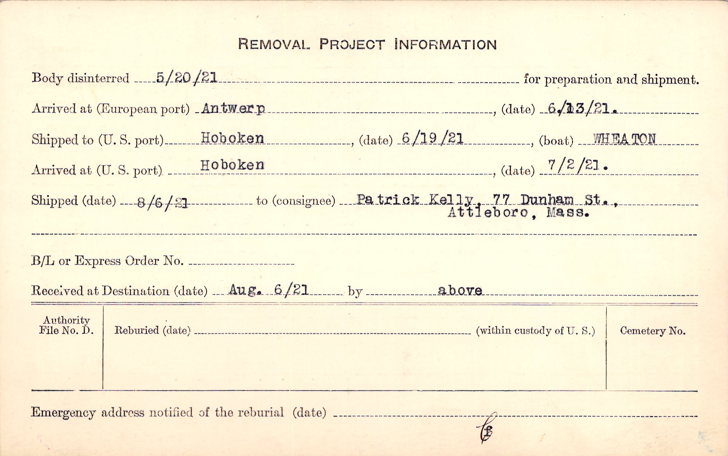 Body disinterred 5/20/1921 for preparation and shipment.