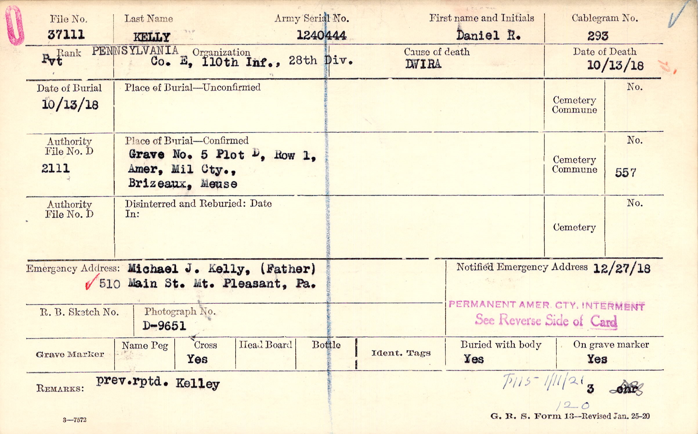 Michael J. Kelly, (Father), 510 Main St. Mt. Pleasant, Pa., 510 PERMANENT AMER. CITY. INTERMENT See Reverse Side of Card