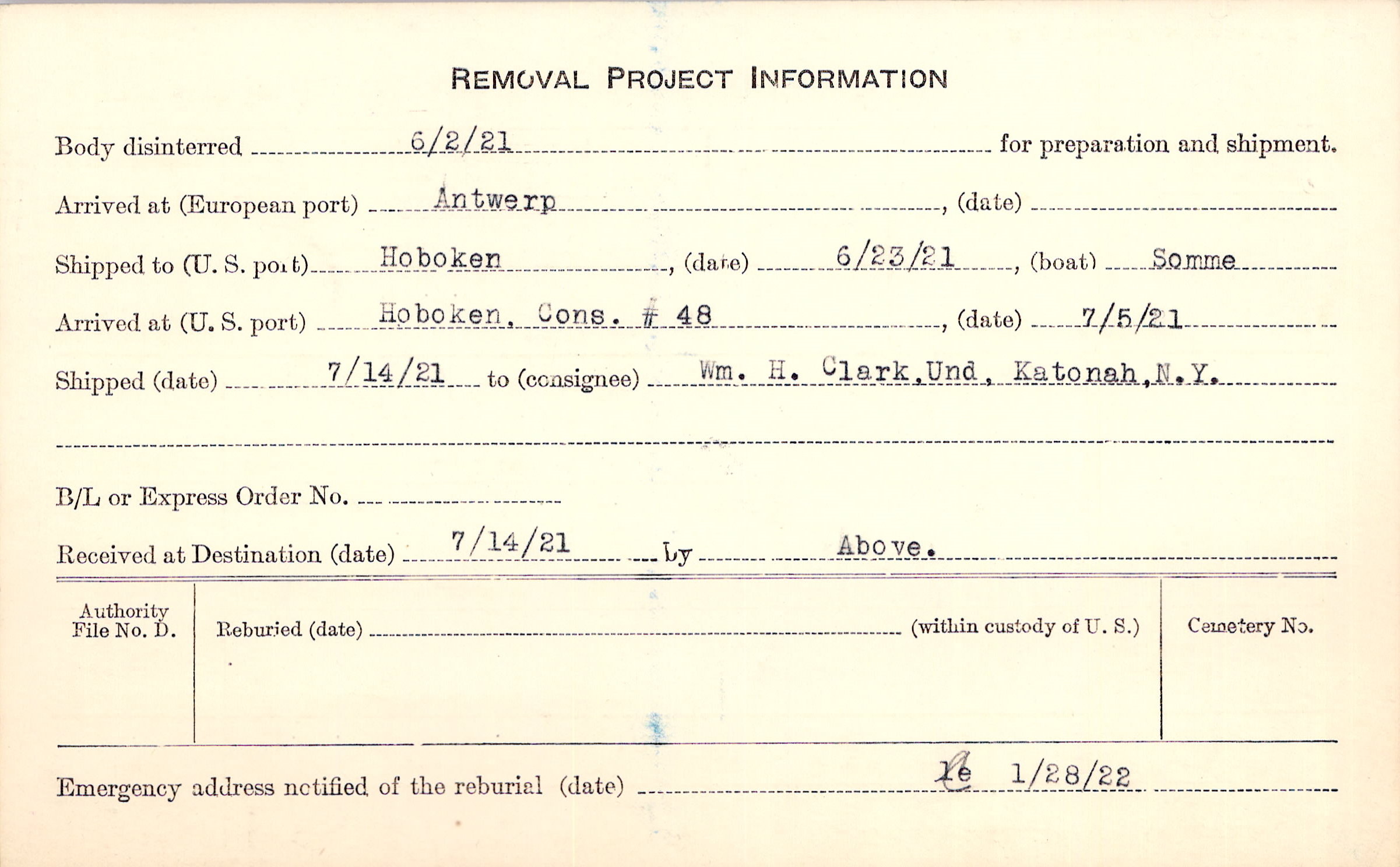 Body disinterred 6/2/1921 for preparation and shipment.