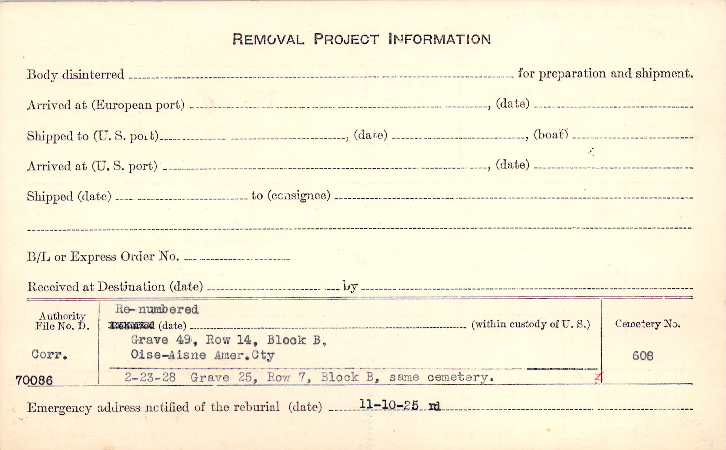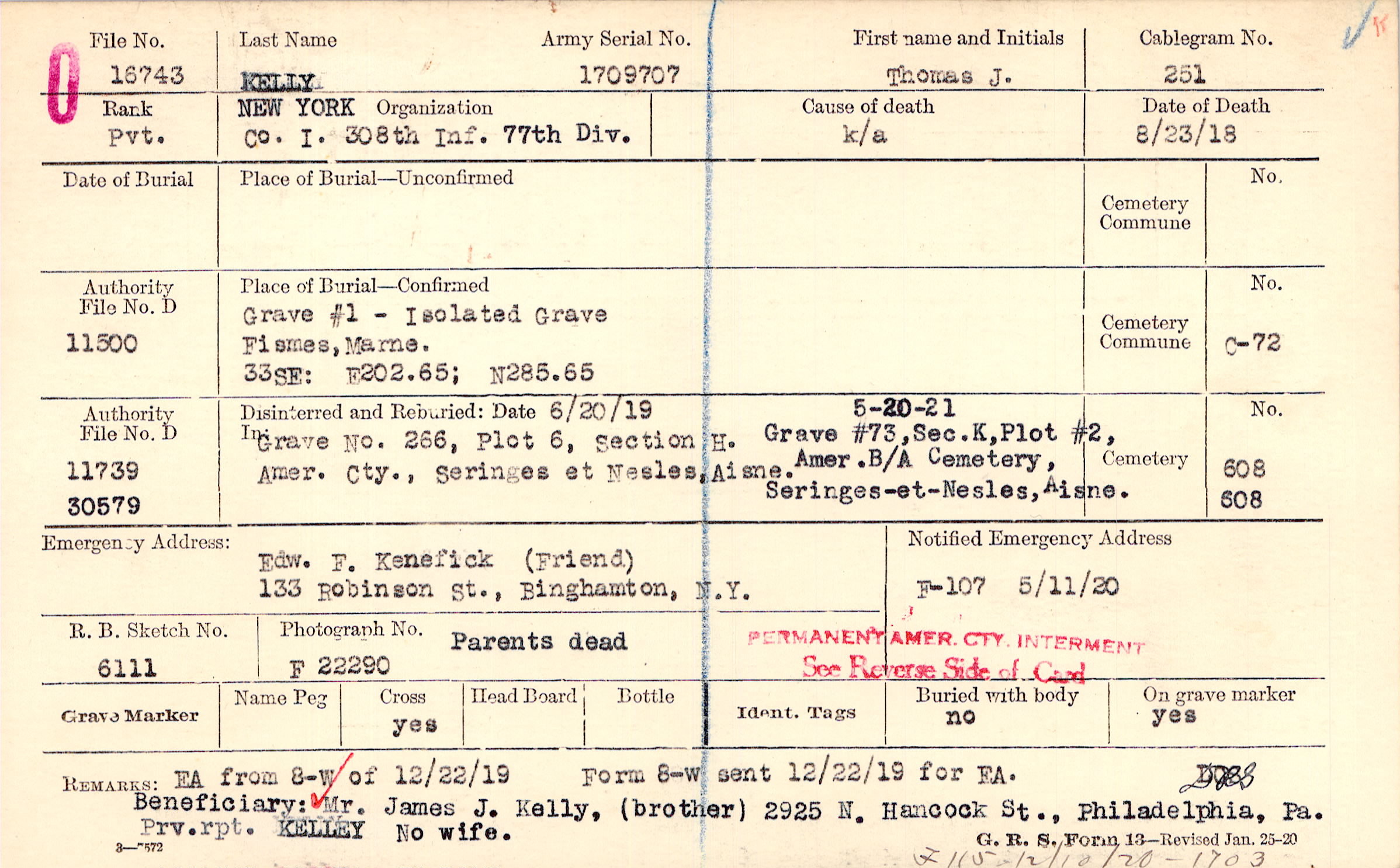 Beneficiary: Mr. James J. Kelly, (brother) 2925 N. Hancock St., Philadelphia, Pa. Prv. rpt. KELLEY No wife., EA from 8-W of 12/22/19 Form 8-w sent 12/22/19 for EA., F115 12/10/20 - 1703