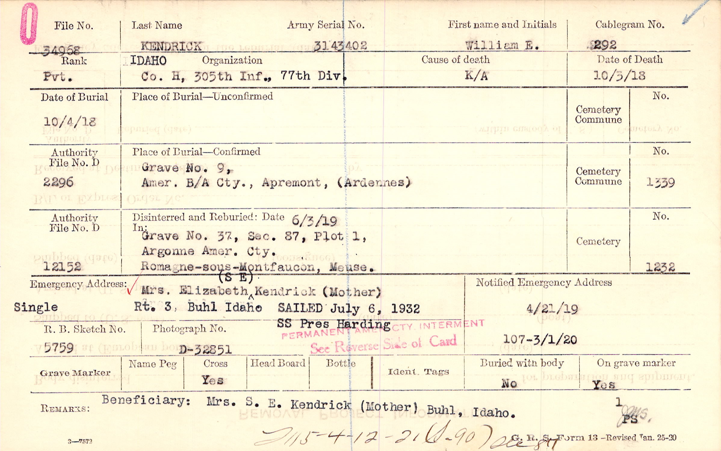 Beneficiary: Mrs. S. E. Kendrick (Mother) Buhl, Idaho, F115-4-12-21 (S-90) sec 817