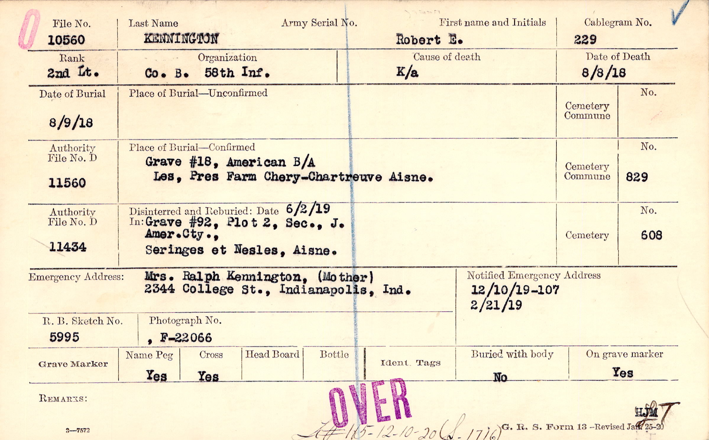 Mrs. Ralph Kennington, (Mother), 2344 College St., Indianapolis, Ind.