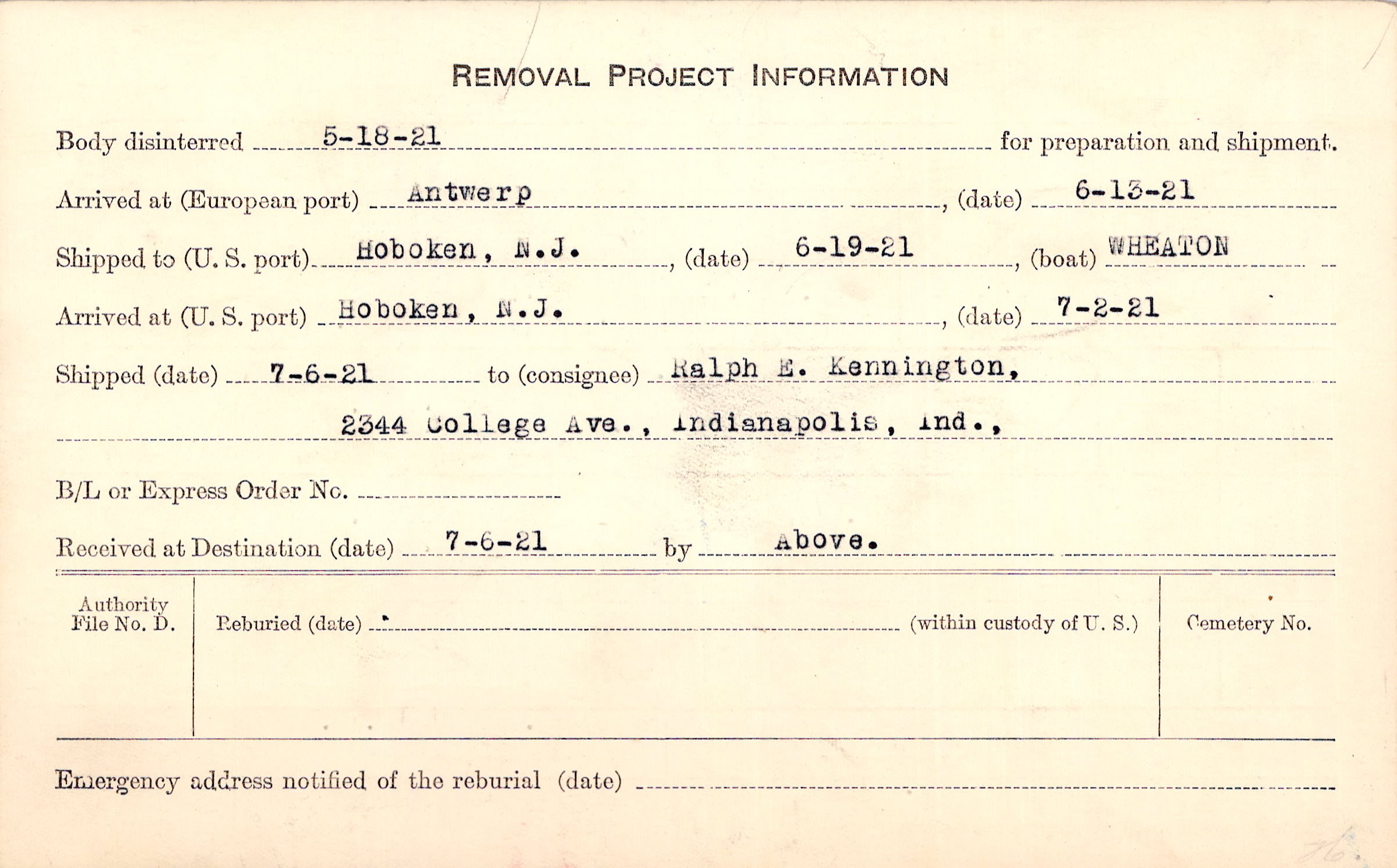 to Ralph E. Kennington, 2344 College Ave., Indianapolis, Ind.,