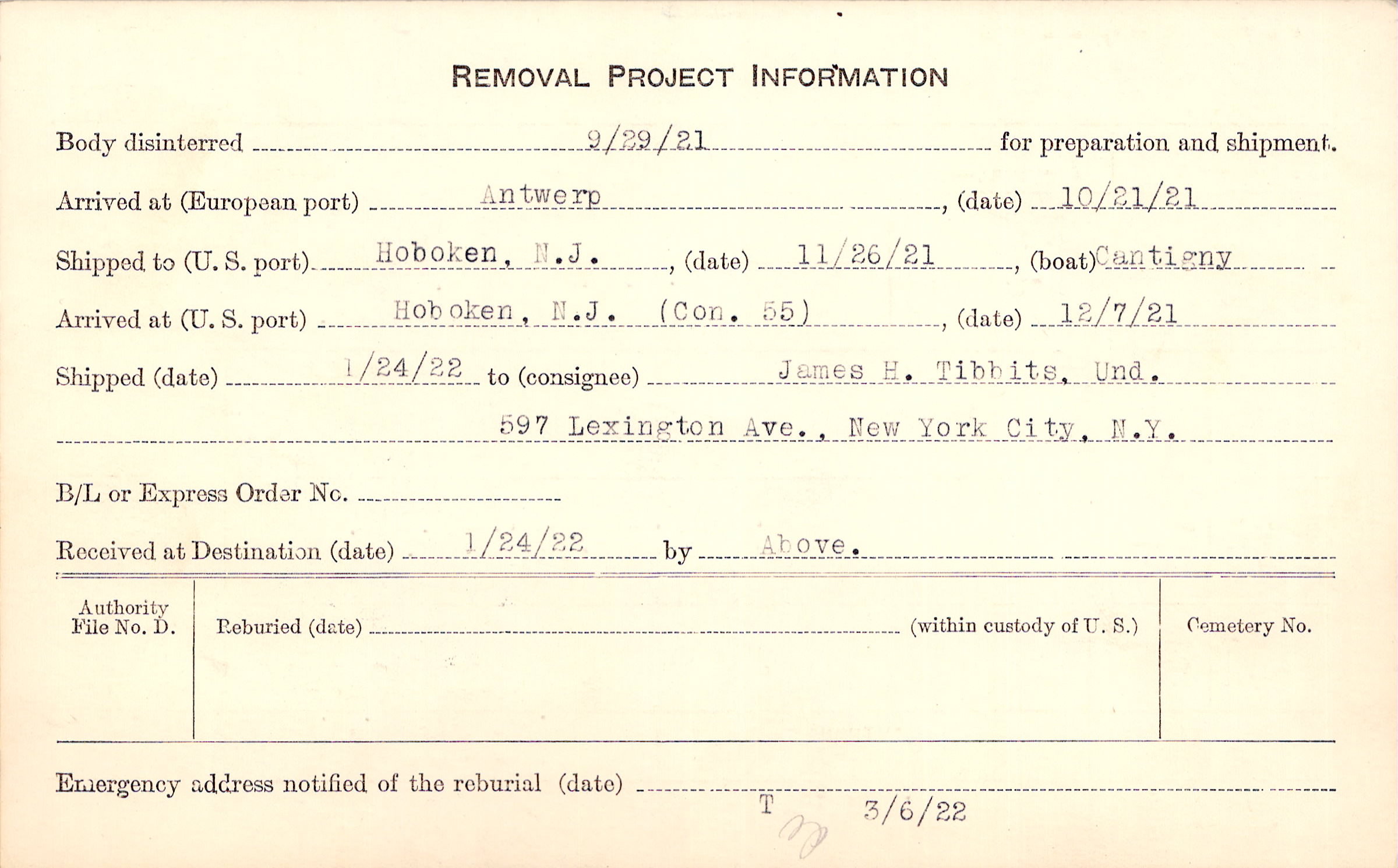 Body disinterred 9/29/1921 for preparation and shipment.