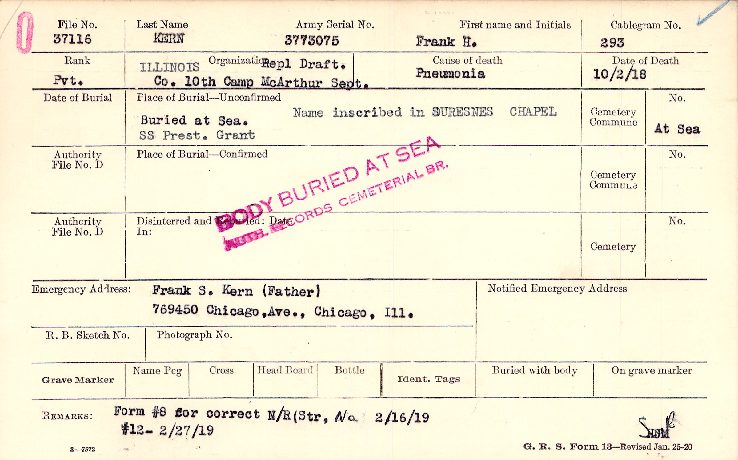 Buried at Sea., SS Prest. Grant, Name inscribed in SURESNES CHAPEL