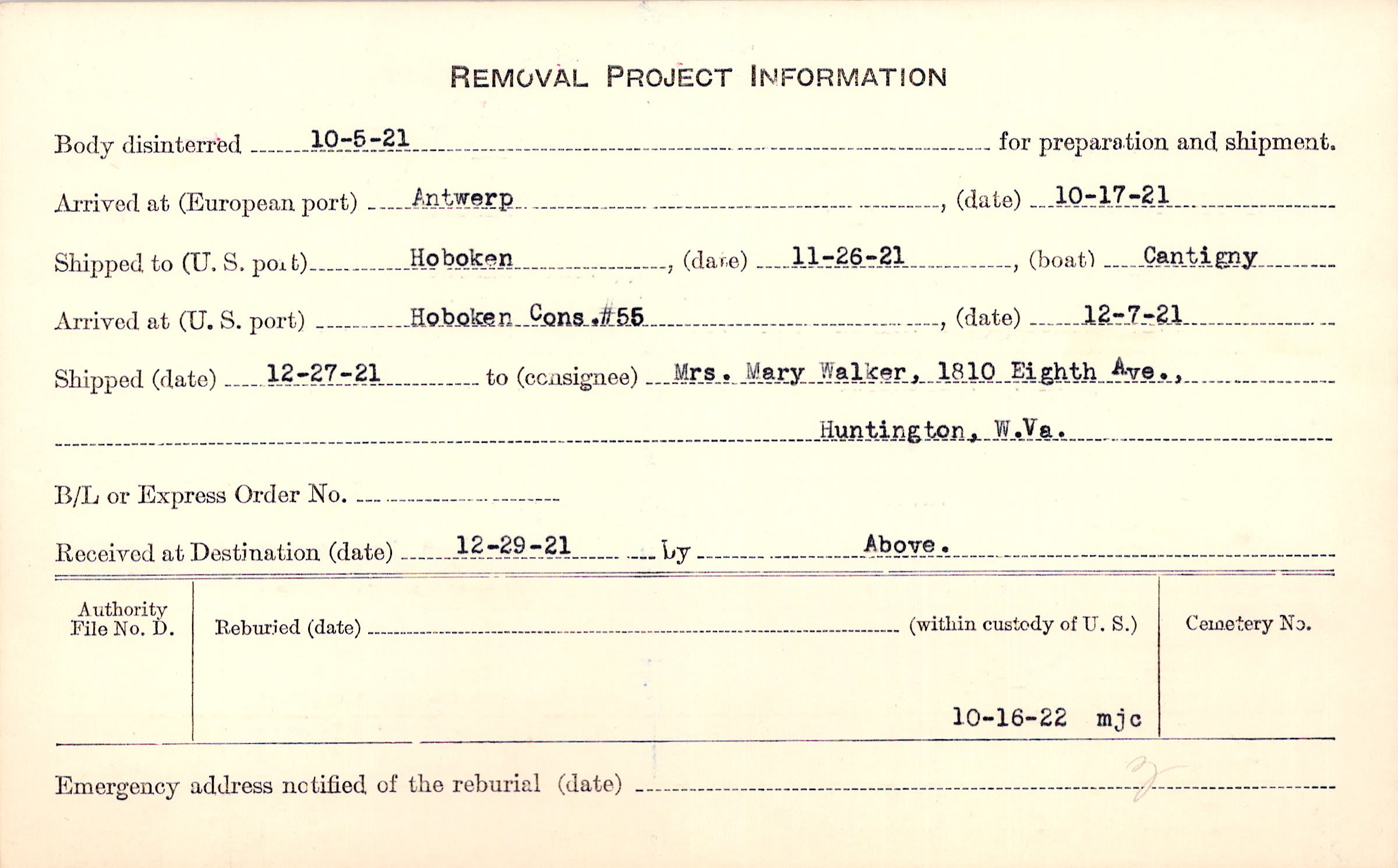 Body disinterred 10/5/1921 for preparation and shipment.