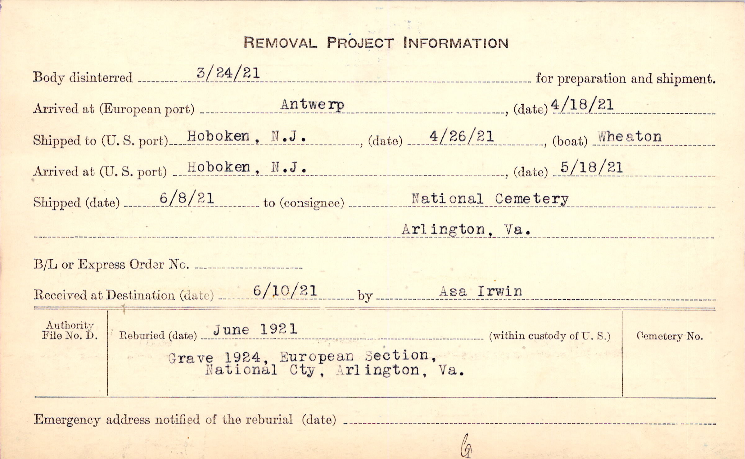 Charles F. Kilborn (Father), Mesa, Colorado., Form #8 sent 6/16/19 for present status. CC-542 reports: buried from field. Probably killed in action Sept. 5th on further information available. DD. prev. rept. as 9/5/18. Auth. A.G.O. letter dated 9/29/20.