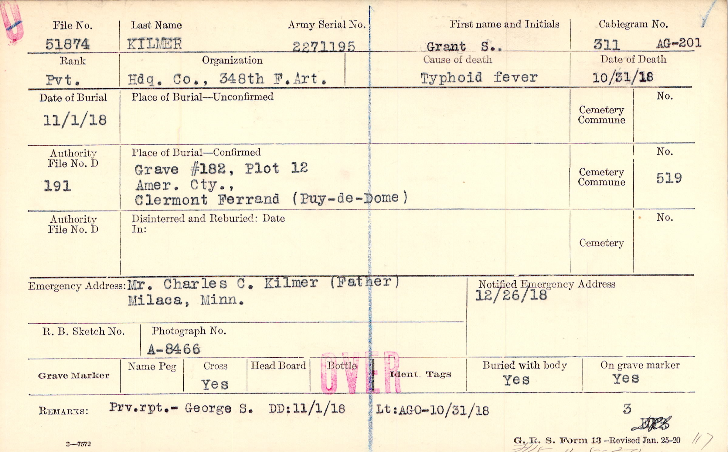 Grave #182, Plot 12, Amer. Cty., Clermont Ferrand (Puy-de-Dome)