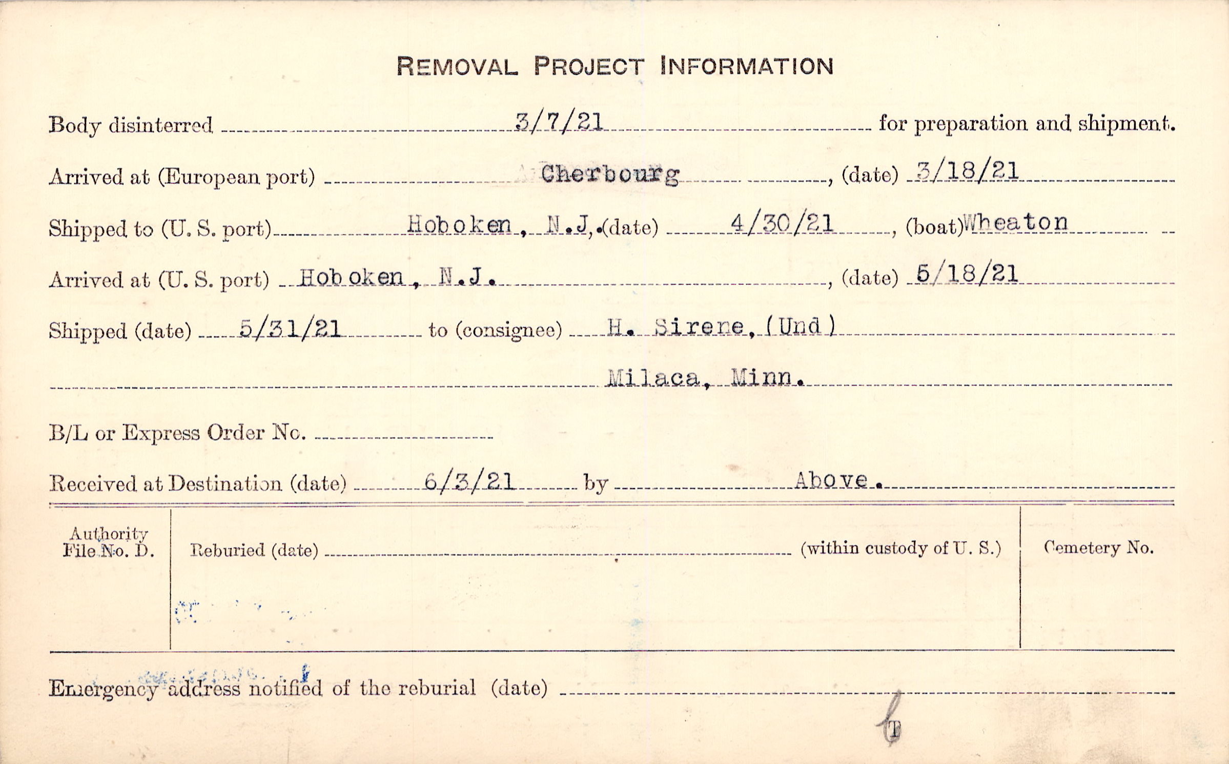 Body disinterred 3/7/1921 for preparation and shipment.