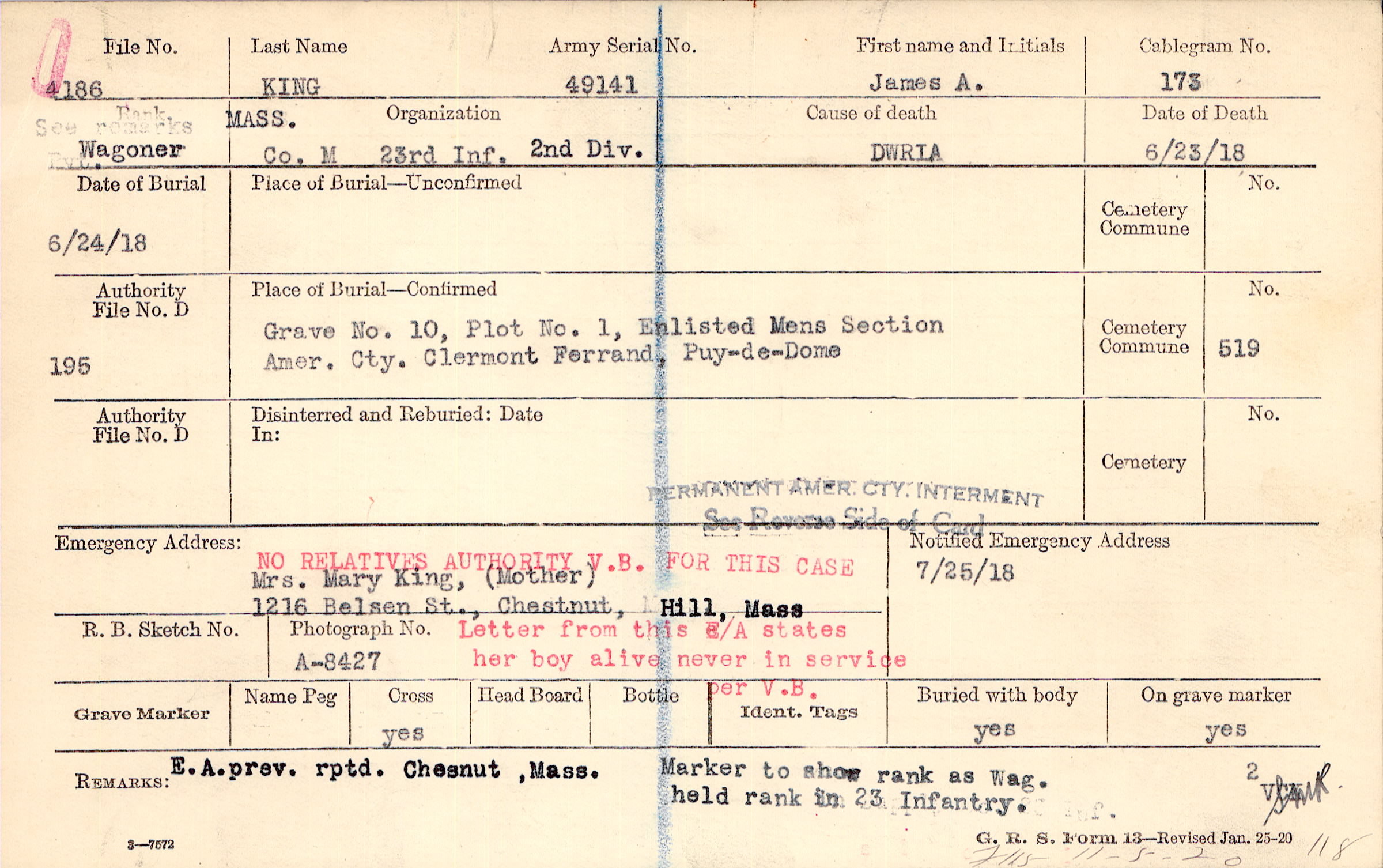 Mrs. Mary King, (Mother), 1216 Belsen St., Chestnut, Hill, Mass, NO RELATIVES AUTHORITY V.B. FOR THIS CASE Letter from this E/A states her boy alive never in service per V.B.