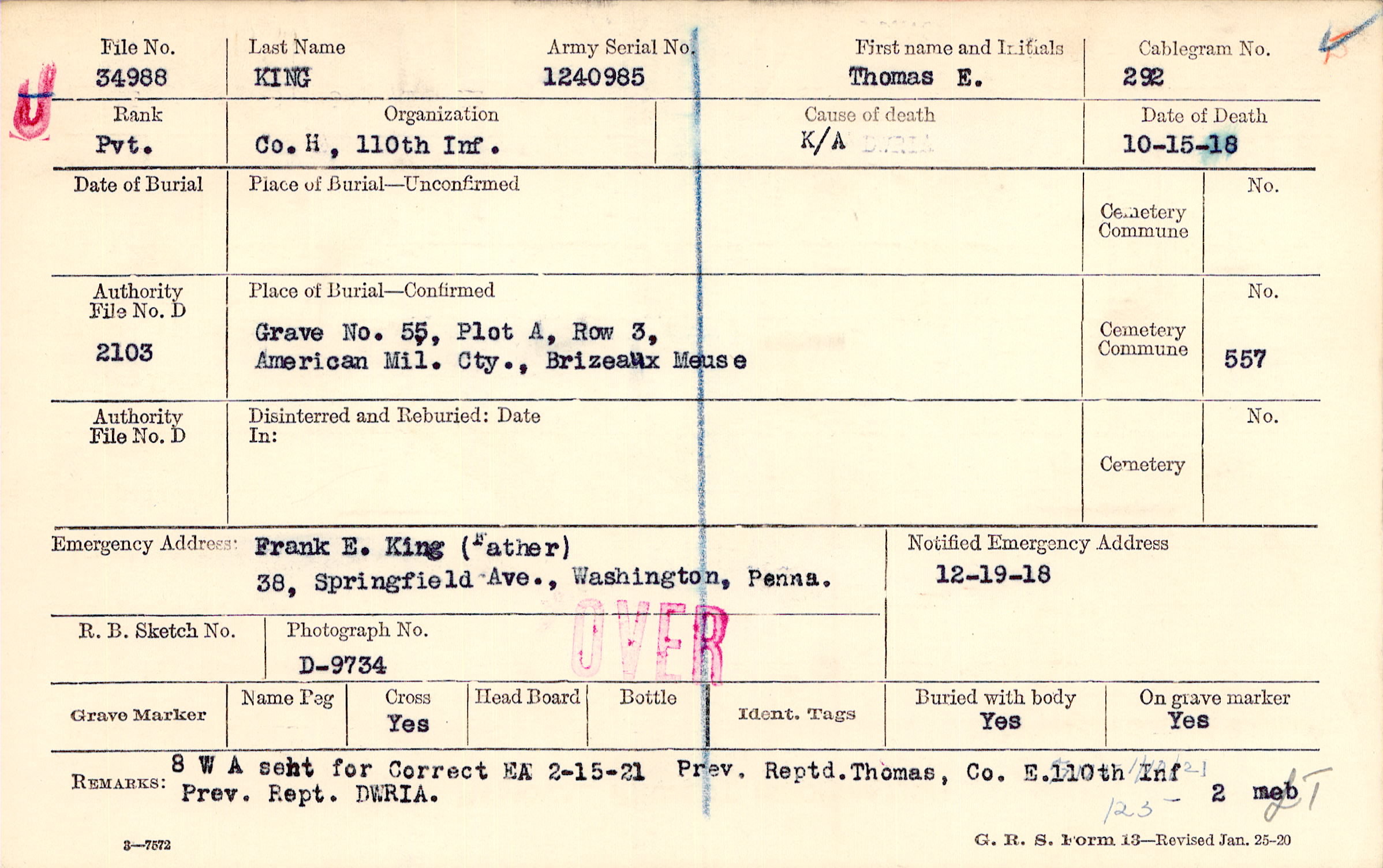 Prev. Reptd. Thomas, Co. E. 110th Inf. Orev. Rept. DWRIA., 8 W A sent for Correct EA 2-15-21, F115 11/10/21 125
