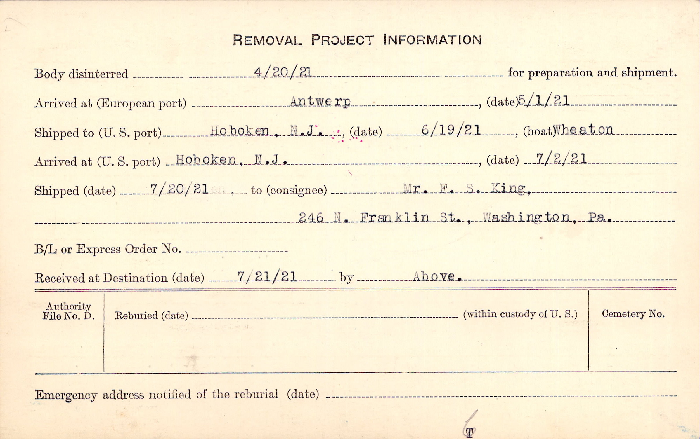 Body disinterred 4/20/1921 for preparation and shipment.