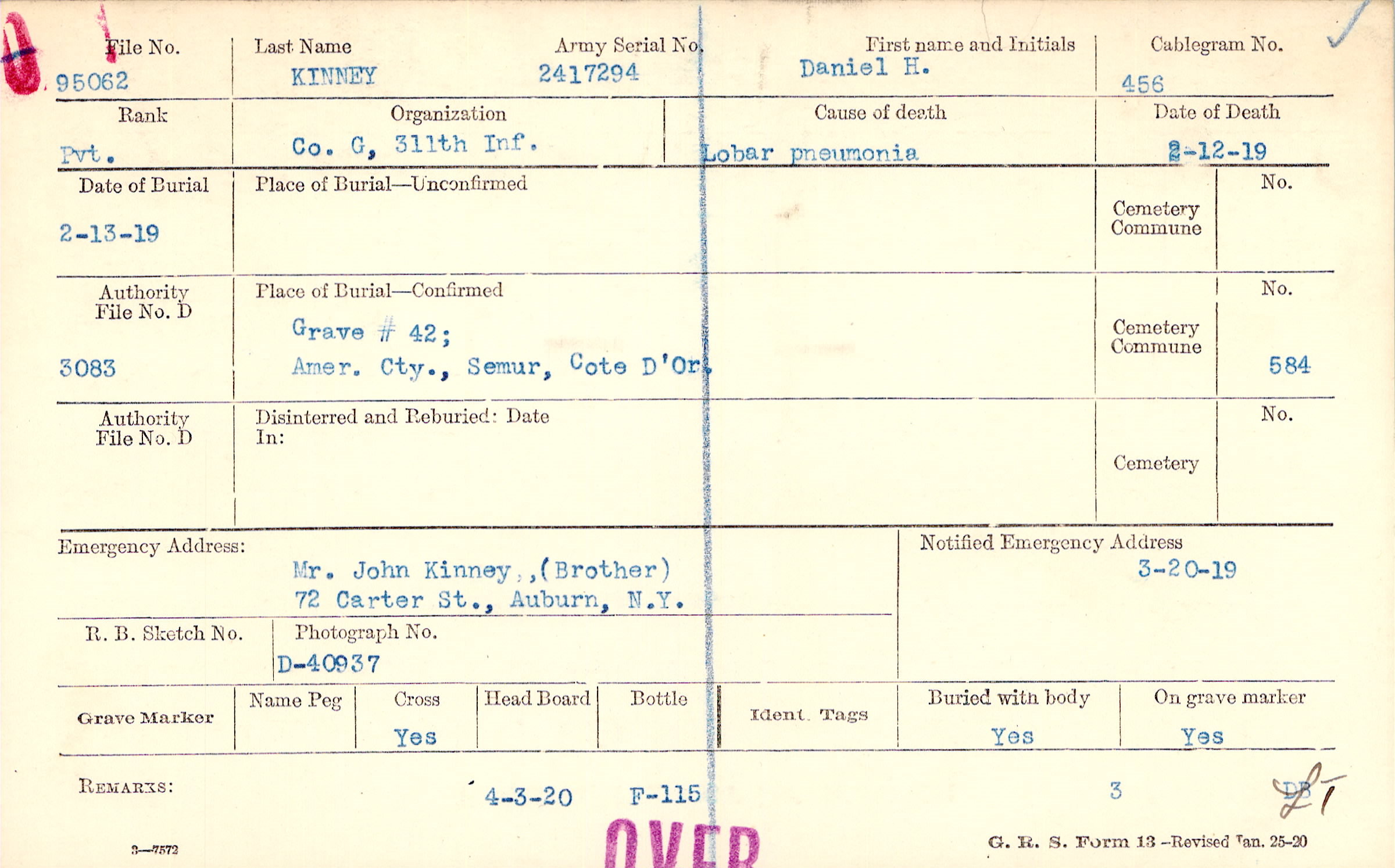 Mr. John Kinney, (Brother), 72 Carter St., Auburn, N.Y.