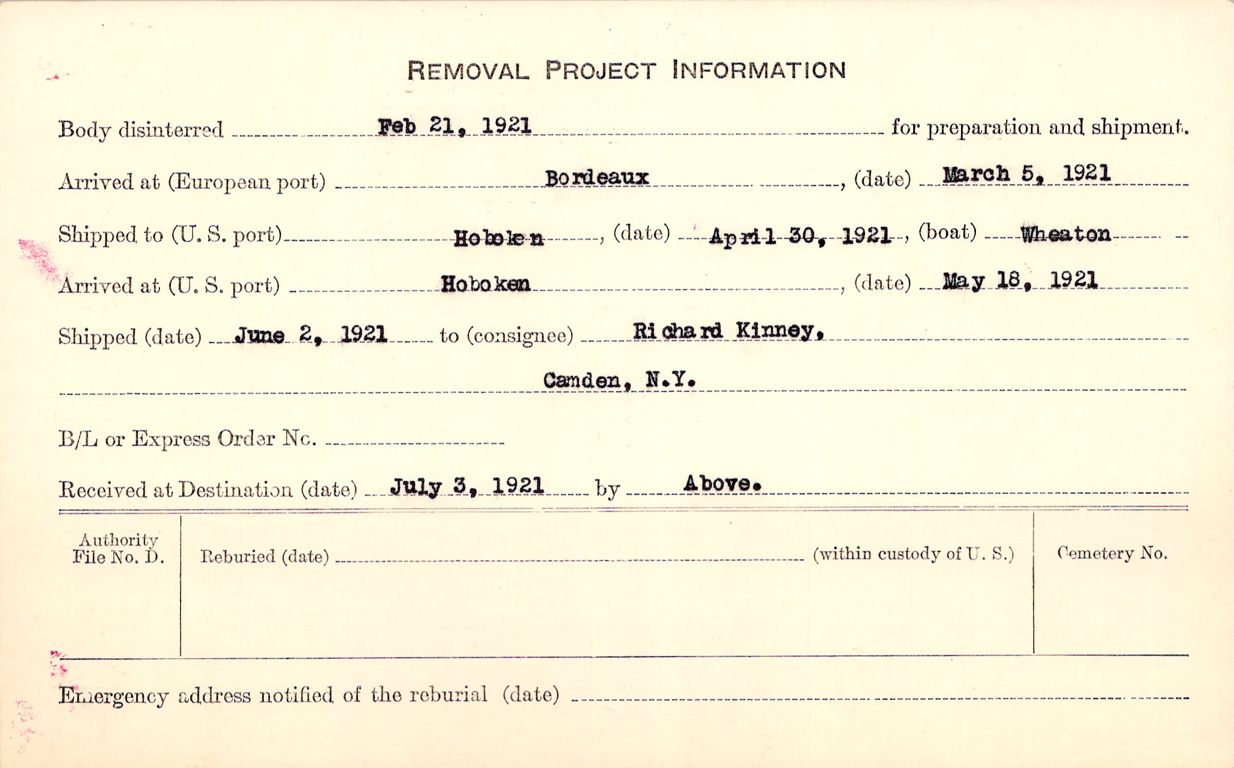 Body disinterred 2/21/1921 for preparation and shipment.