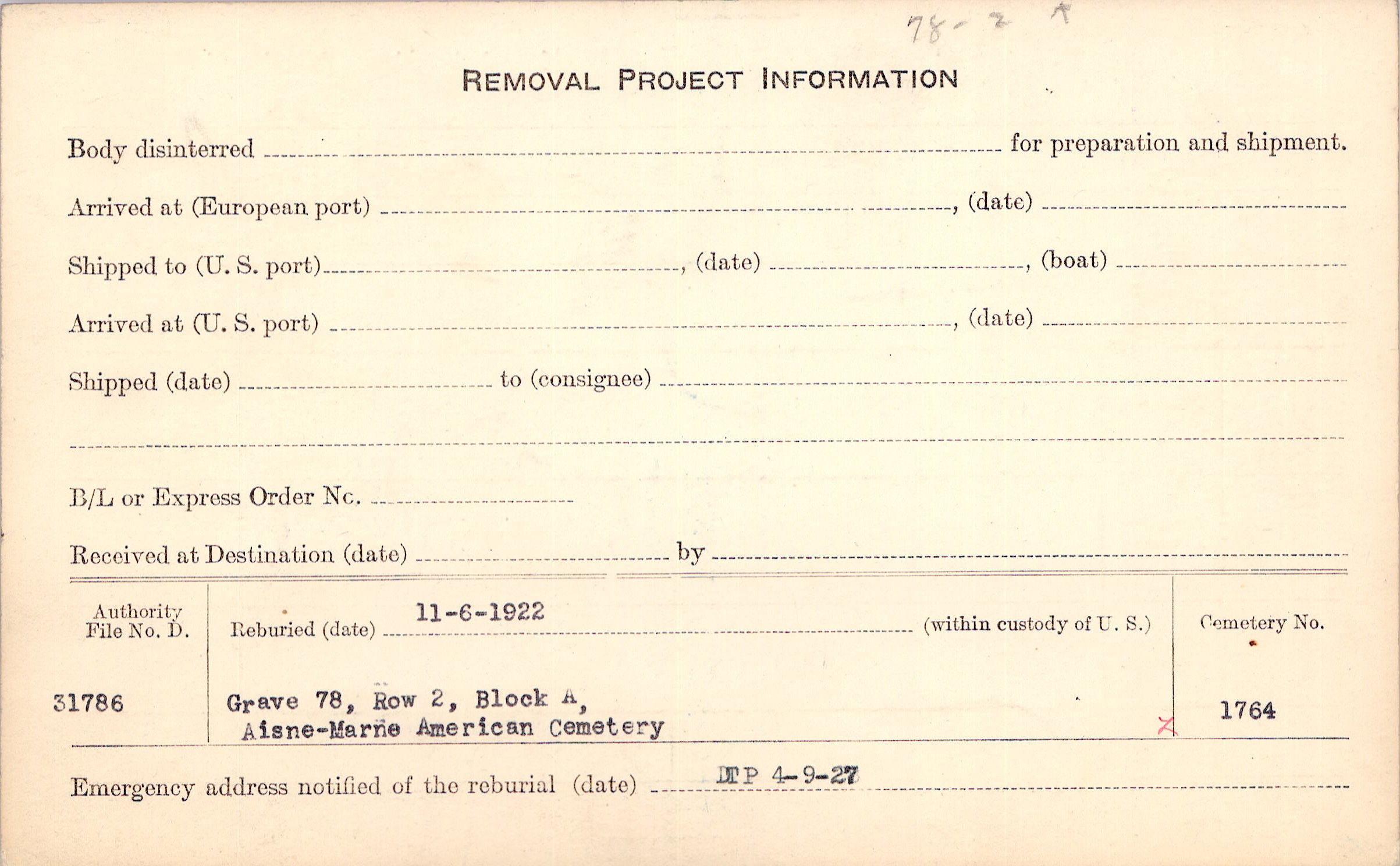 Grave 83, Section A, Plot 2, American Cemetery, Belleau, Aisne