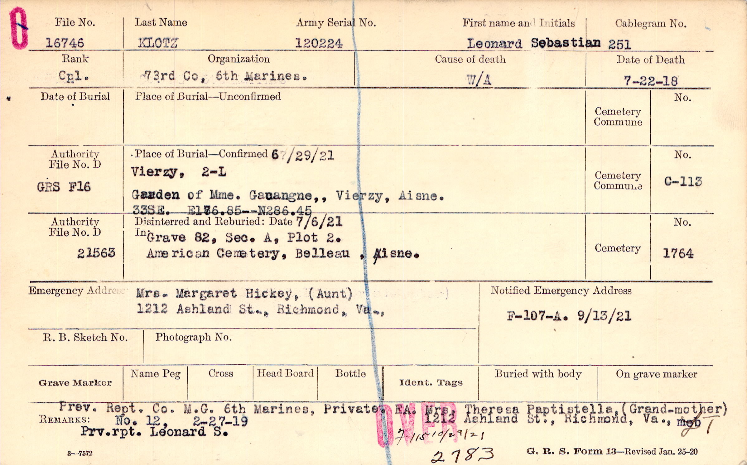 Mrs. Margaret Hickey, (Aunt), 1212 Ashland St., Richmond, Va.,