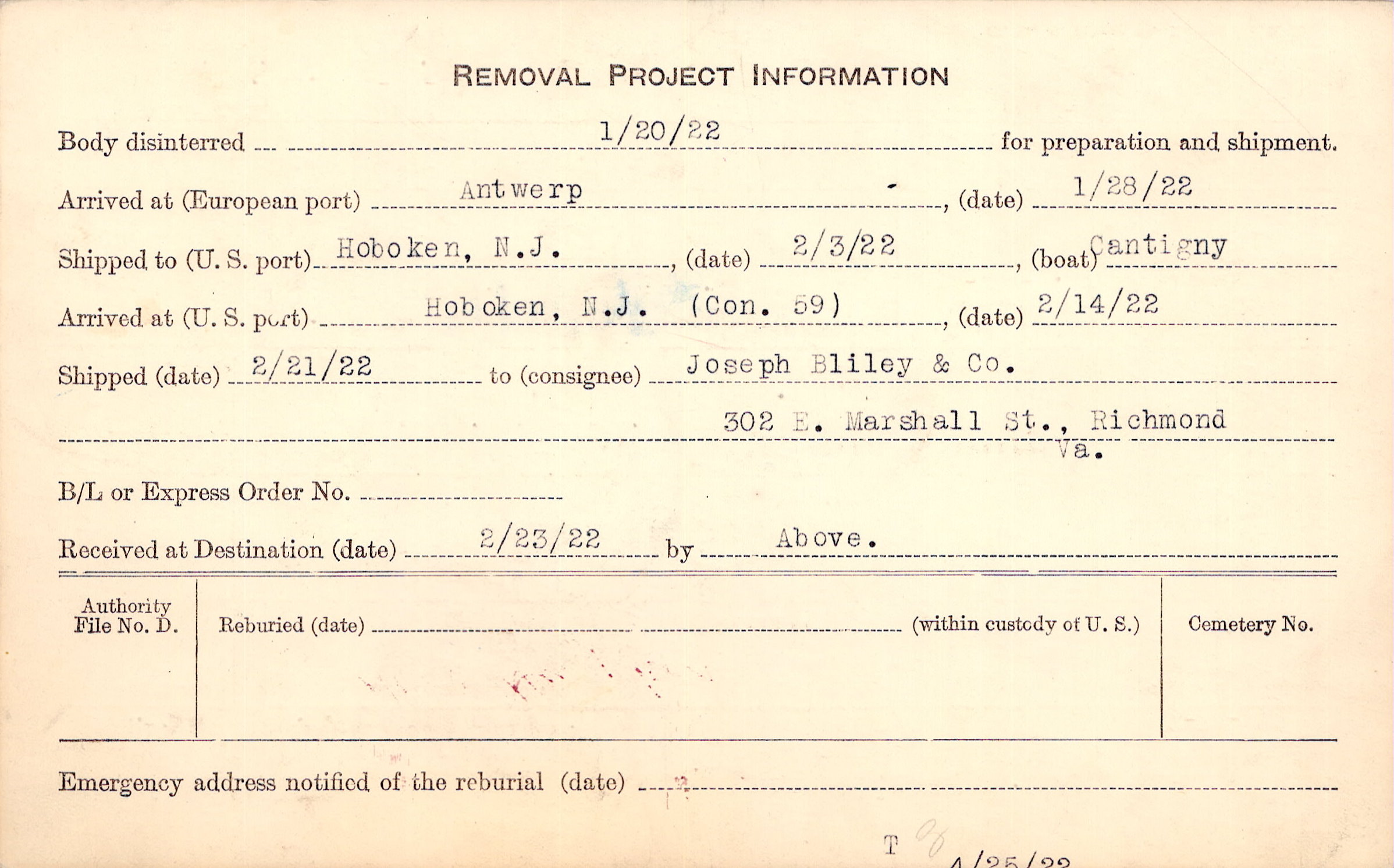 Body disinterred 1/20/1922 for preparation and shipment.