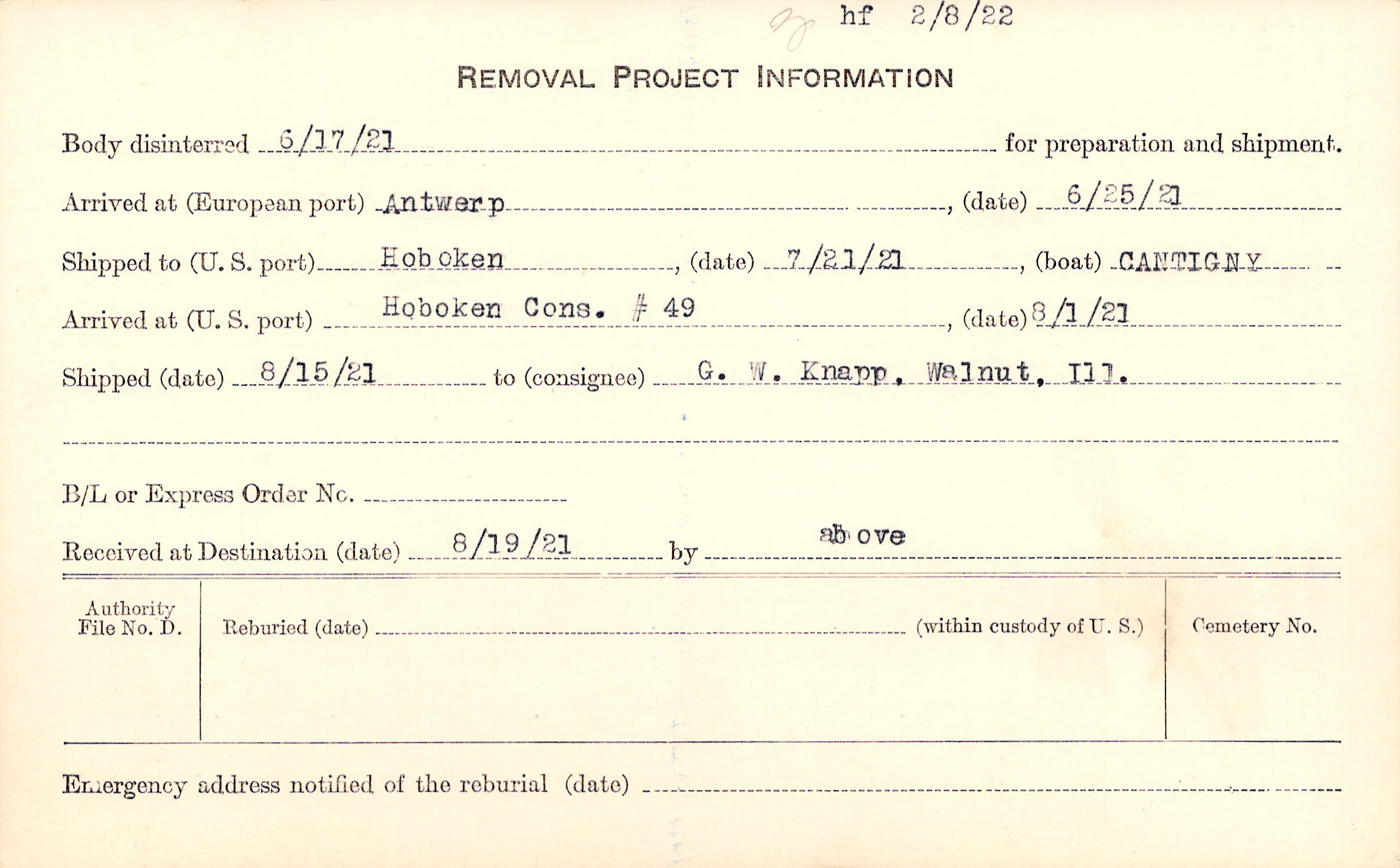 Body disinterred 6/17/1921 for preparation and shipment.