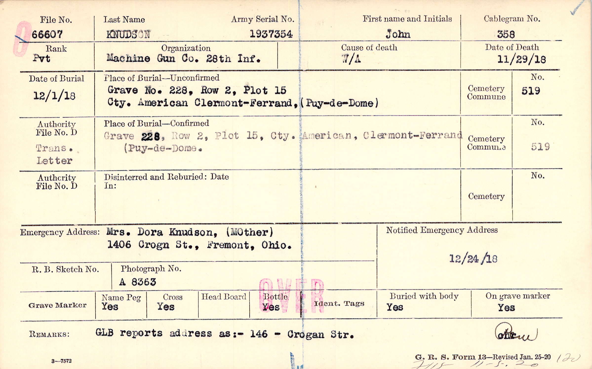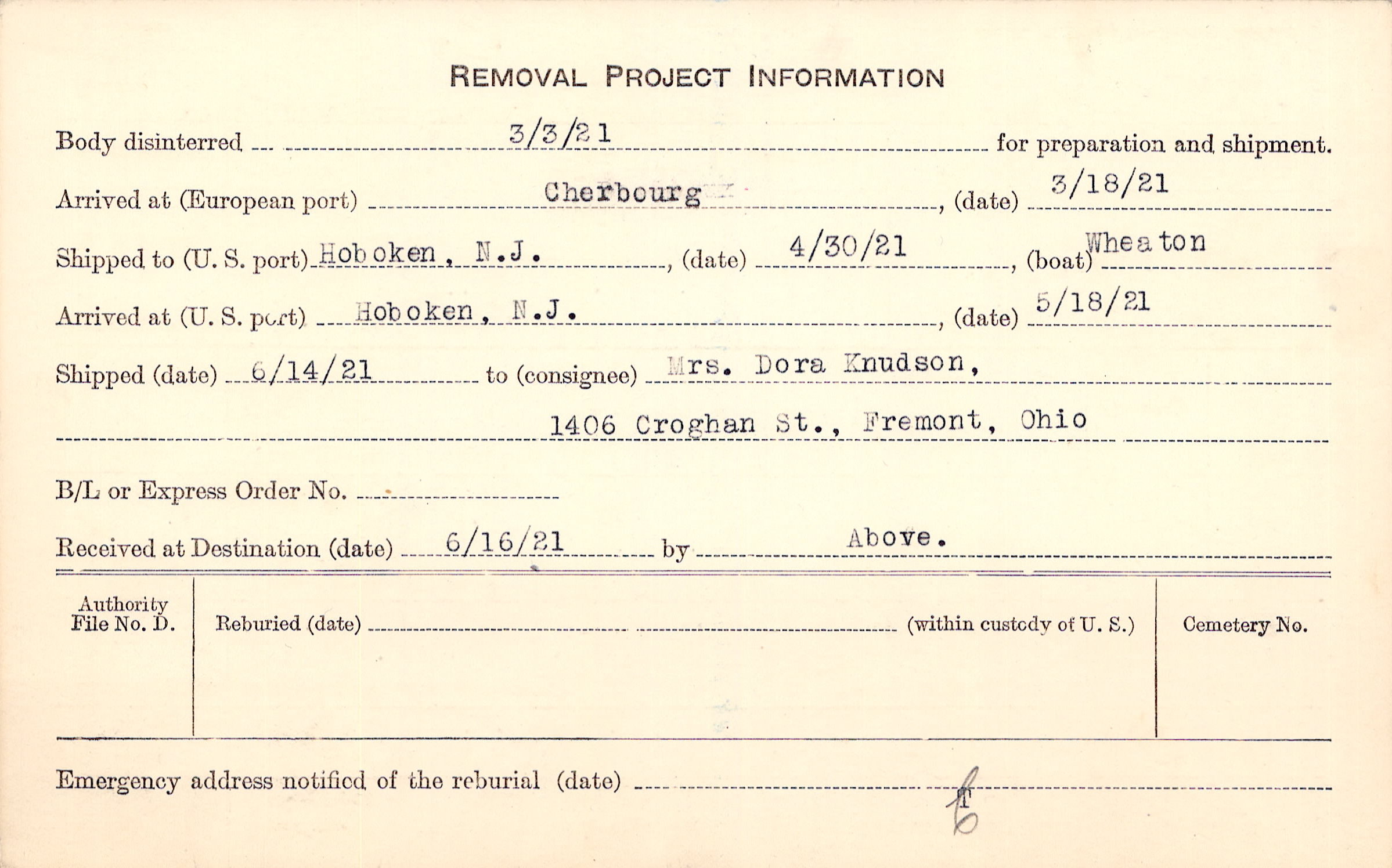 Mrs. Dora Knudson, (Mother), 1406 Crogn St., Fremont, Ohio.