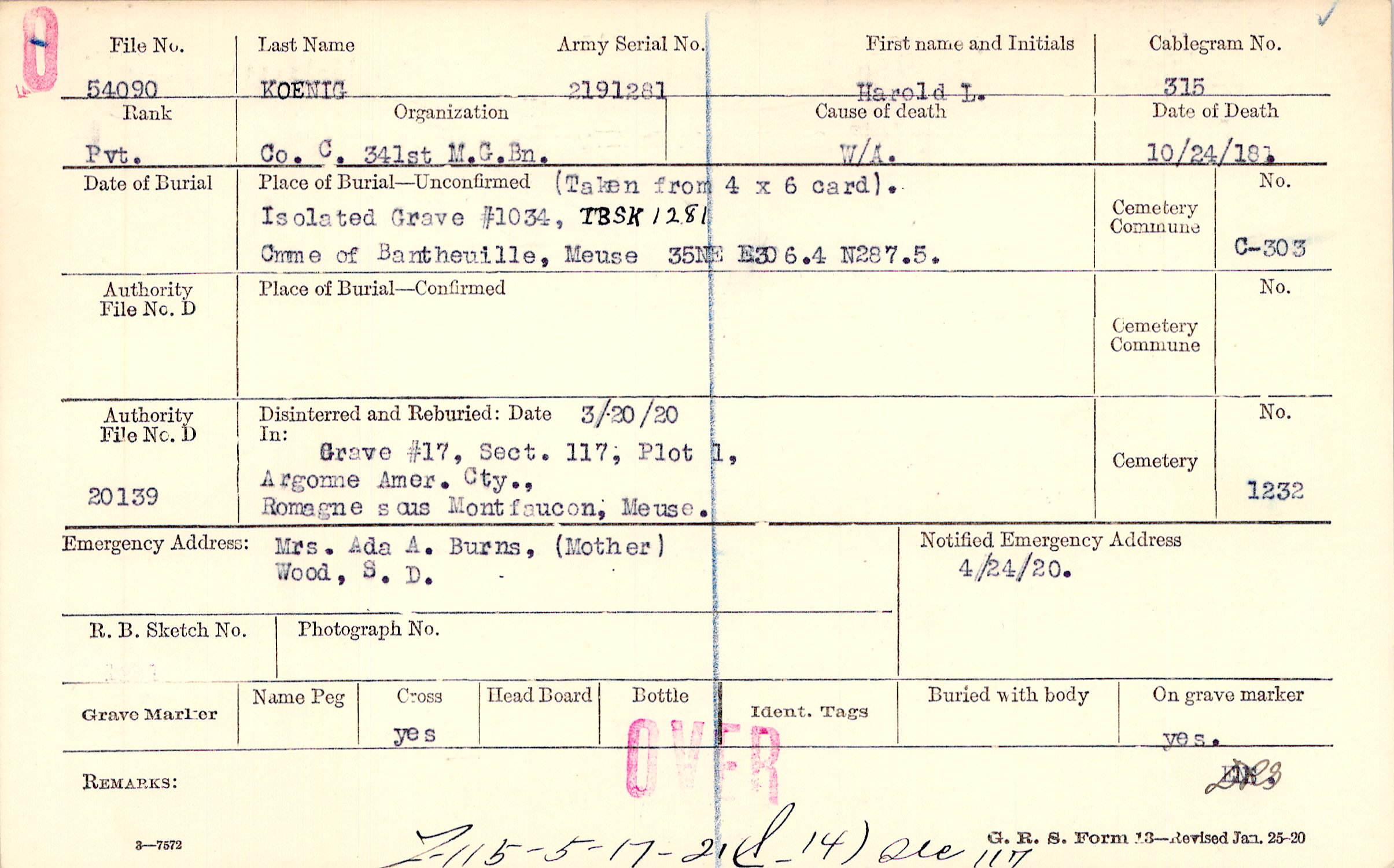 Isolated Grave #1034, TBSK 1281, Cmme of Bantheuille, Meuse, 35 NE
