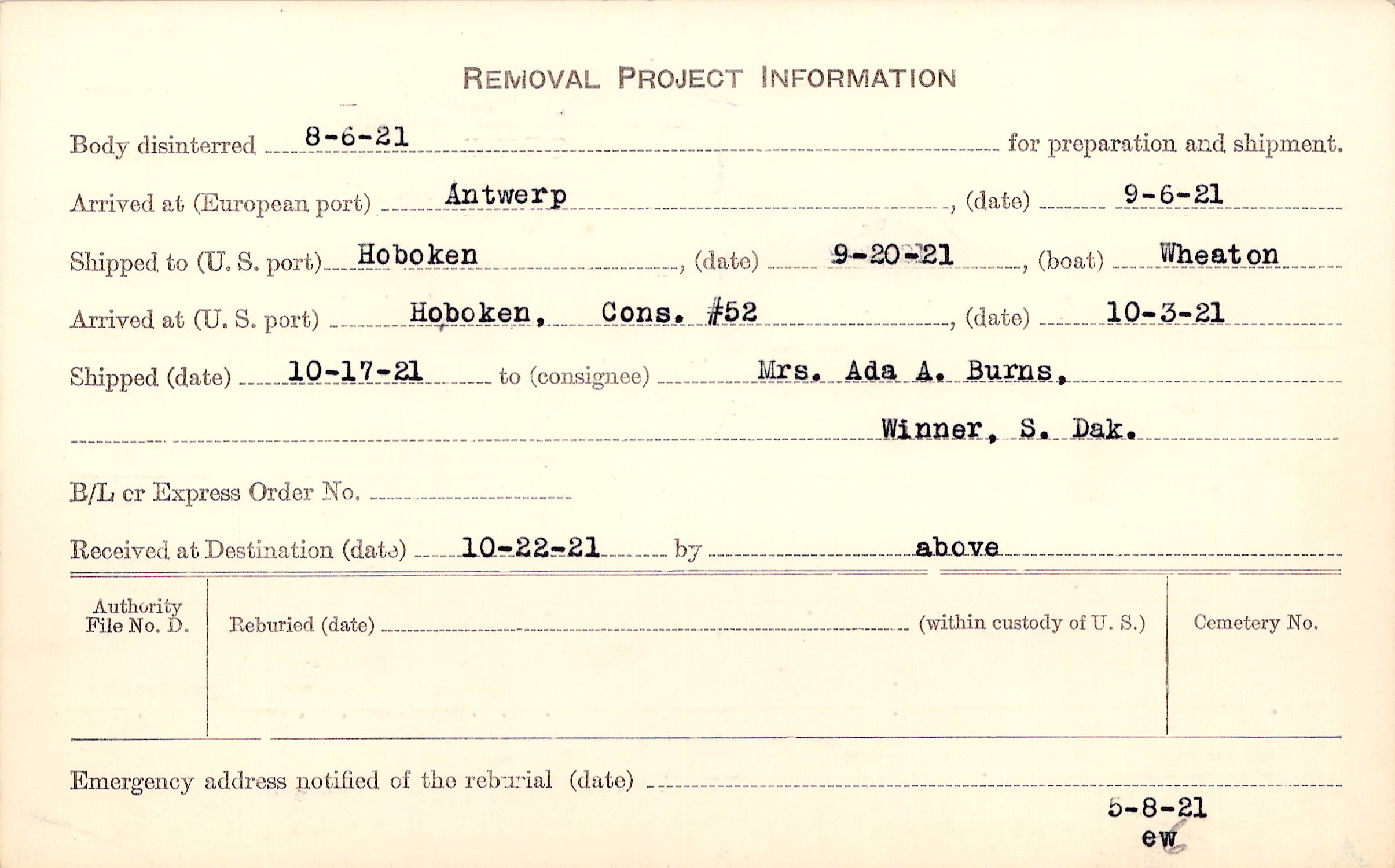Body disinterred 8/6/1921 for preparation and shipment.