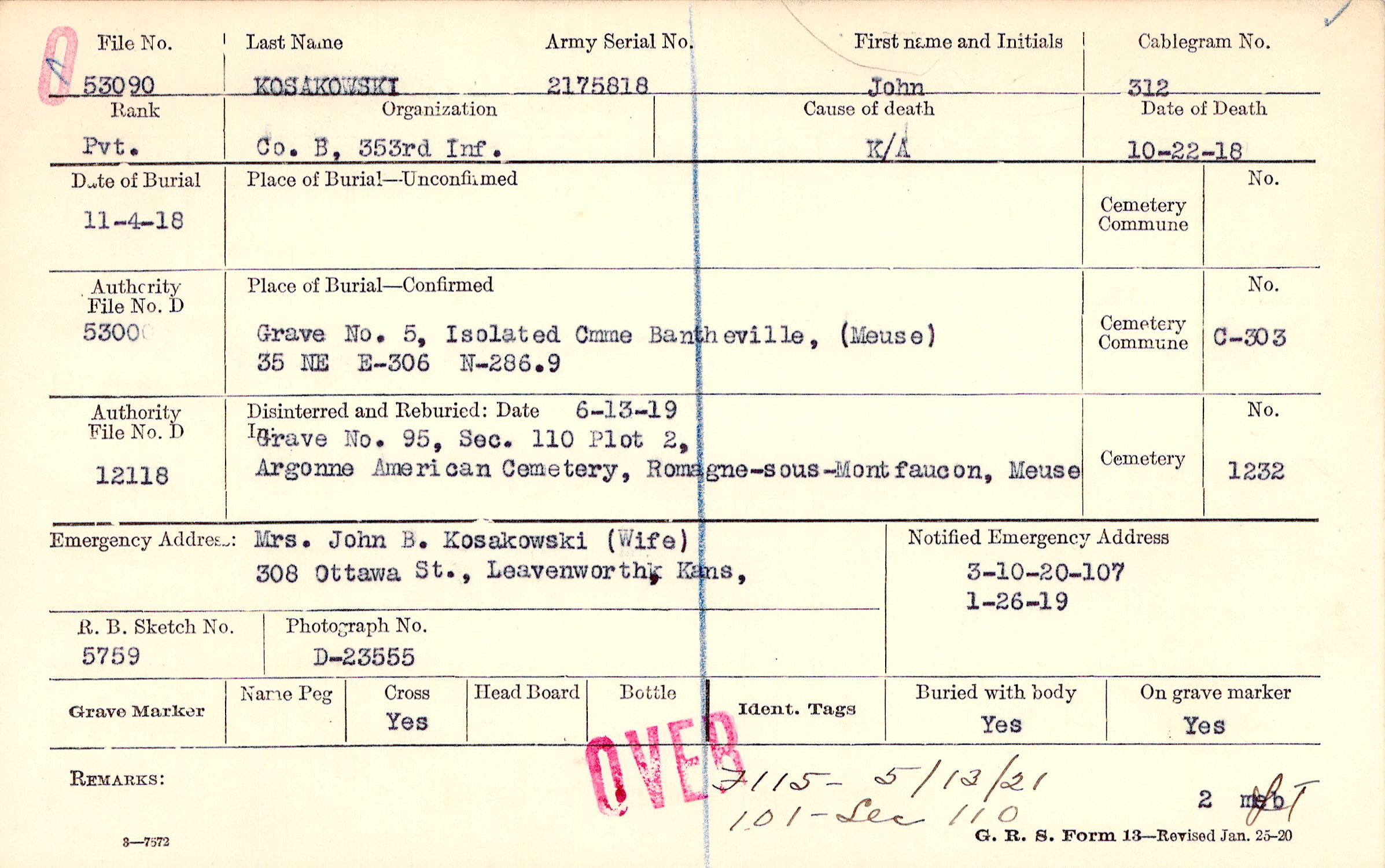 Mrs. John B. Kosakowski (Wife), 308 Ottawa St., Leavenworth, Kans.