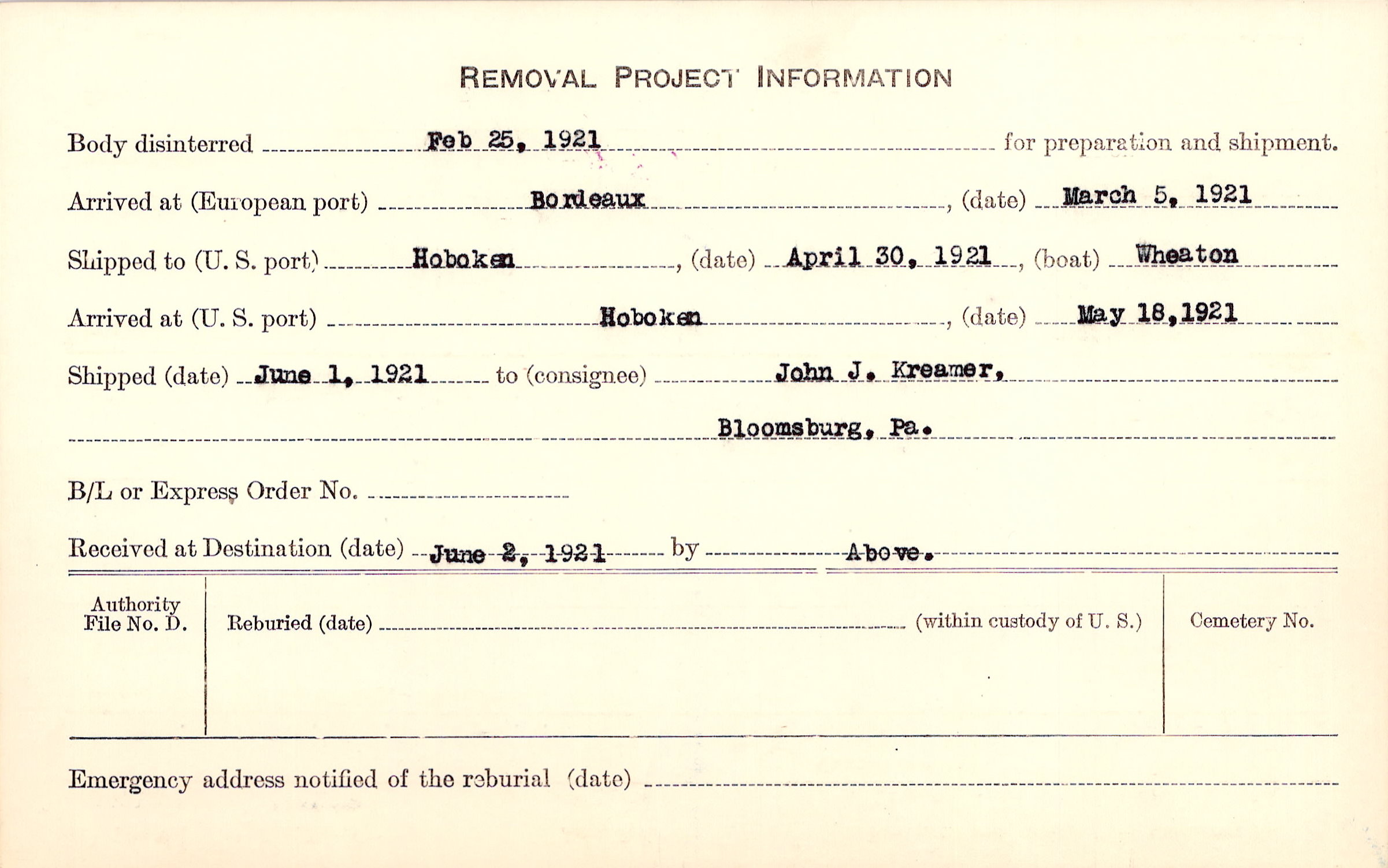 Body disinterred 2/25/1921 for preparation and shipment.