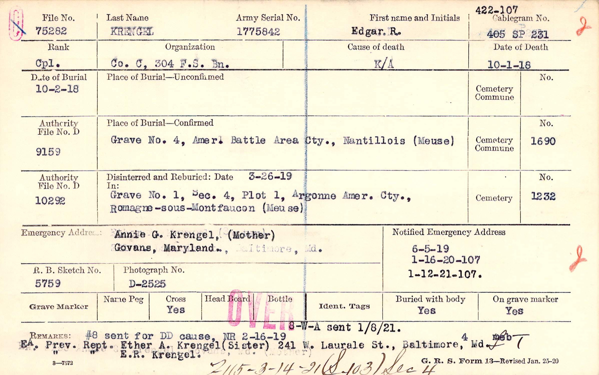 EA, Prev. Rept. Ether A. Krengel (Sister) 241 W. Laurale St., Baltimore, Md. Prev. Rept. E. R. Krengel., #8 sent for DD cause, NR 2-16-19, F115-3-14-21 (S103) Sec 4