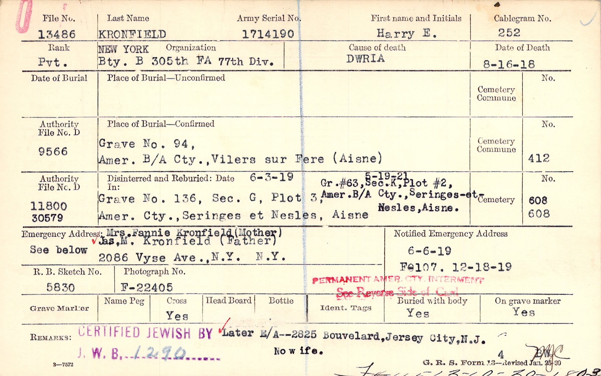 Mrs. Fannie Kronfield (Mother) Jas, M. Kronfield (Father), 2086 Vyse Ave., N.Y. N.Y., see below