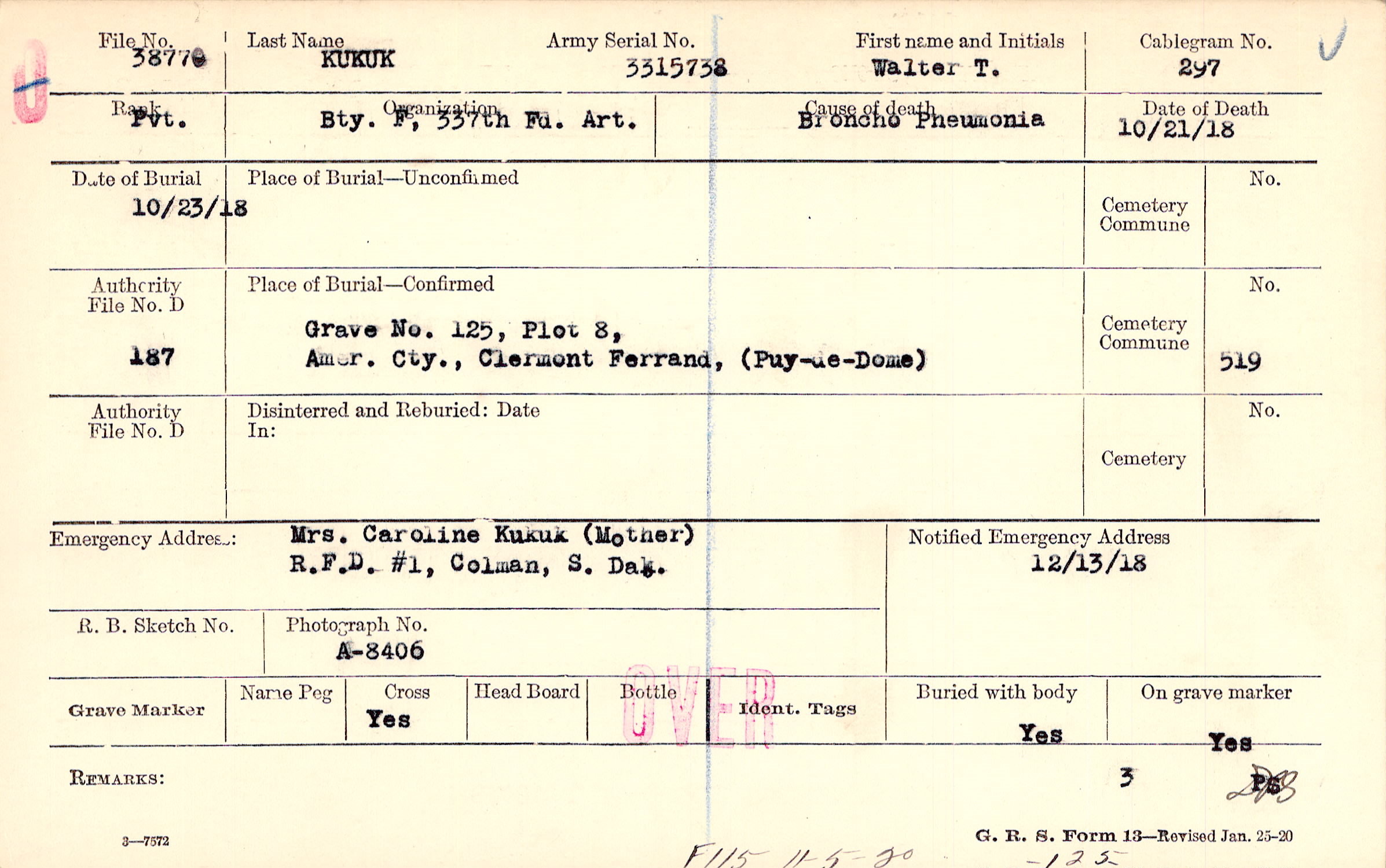 Grave 125, Plot 8, Amer. Cty., Clermont Ferrand, Puy-de-Dome