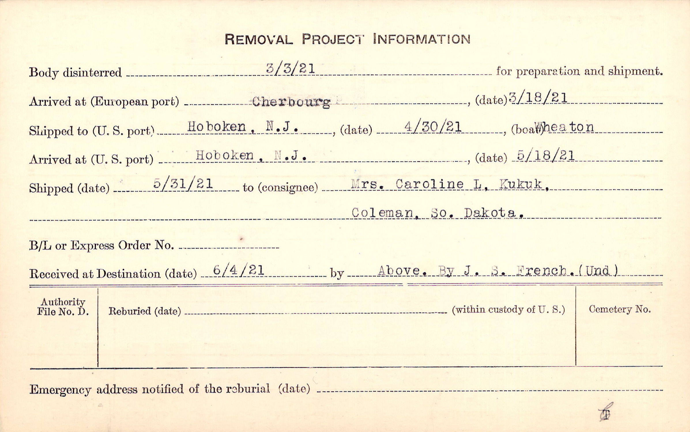 Body disinterred 3/3/1921 for preparation and shipment.