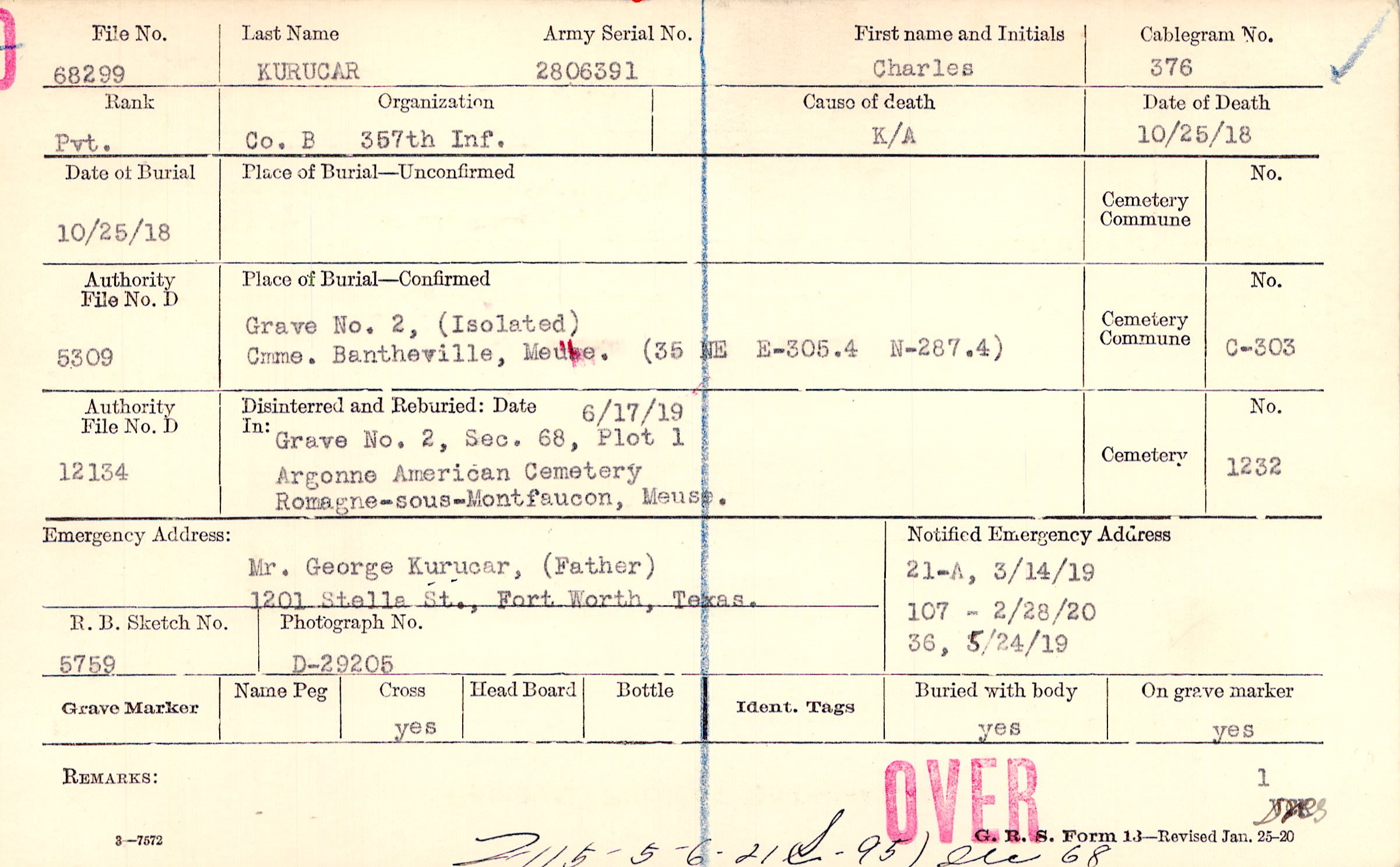 Mr. George Kurucar, (Father), 1201 Stella St., Fort Worth, Texas.