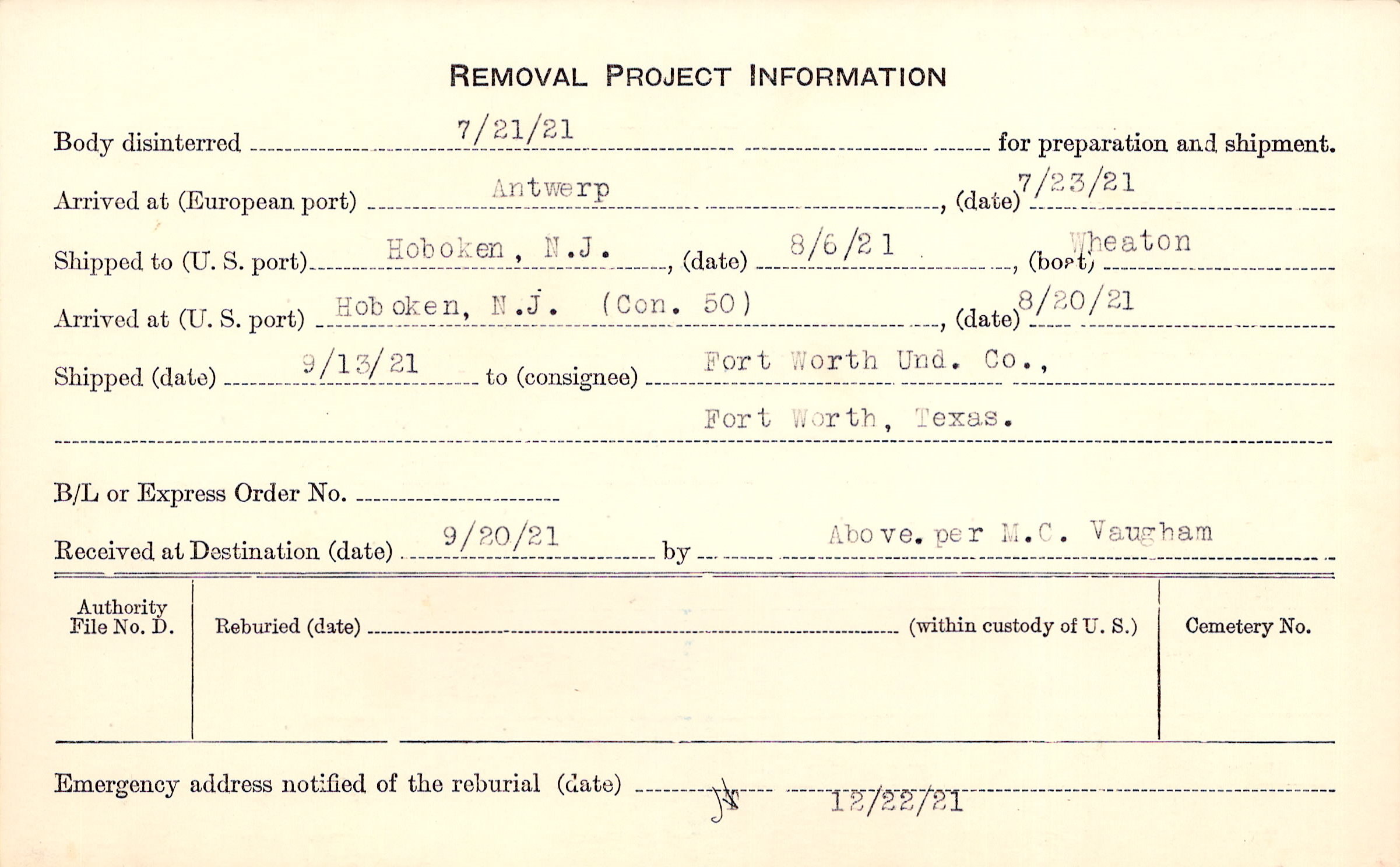 Body disinterred 7/21/1921 for preparation and shipment.