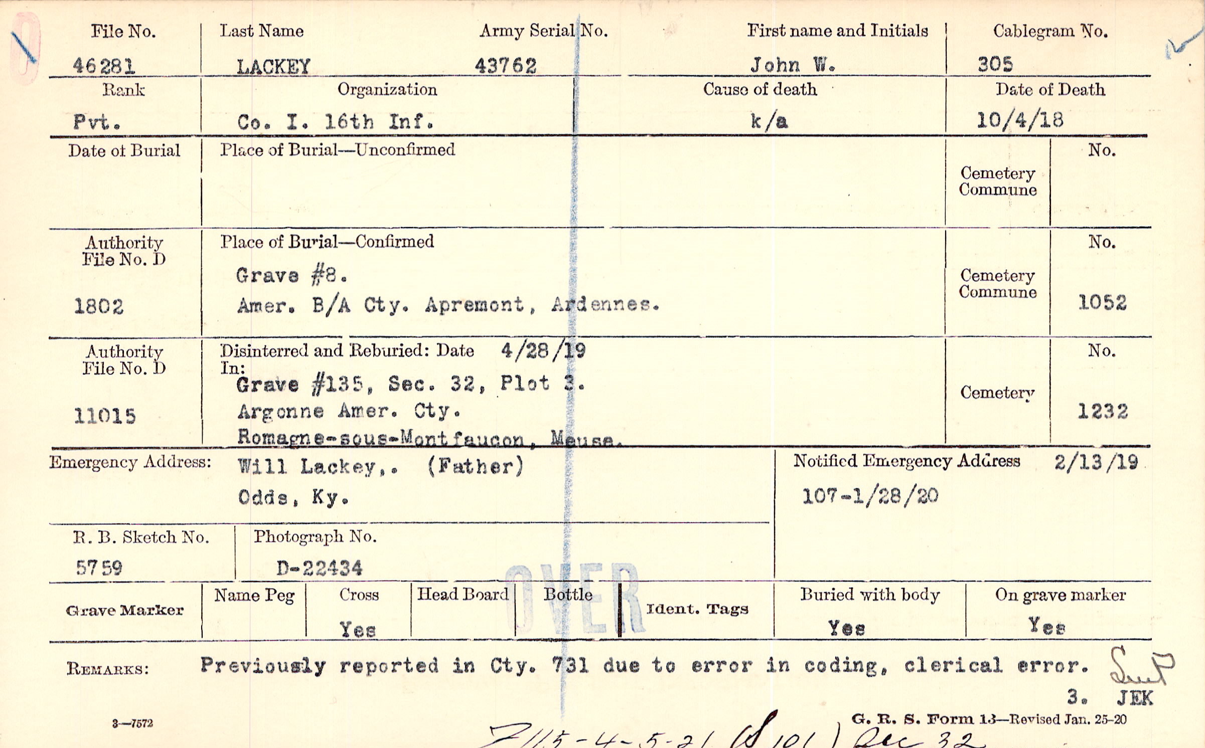 Body disinterred 7/27/1921 for preparation and shipment.