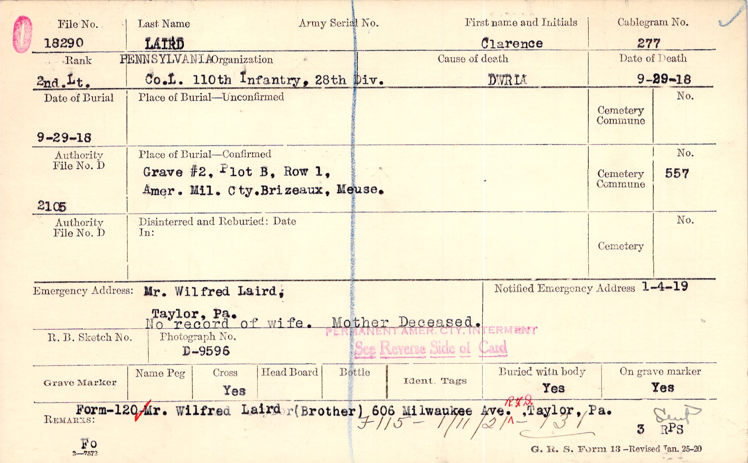 Mr. Wilfred Laird,, Taylor, Pa., No record of wife. Mother Deceased.