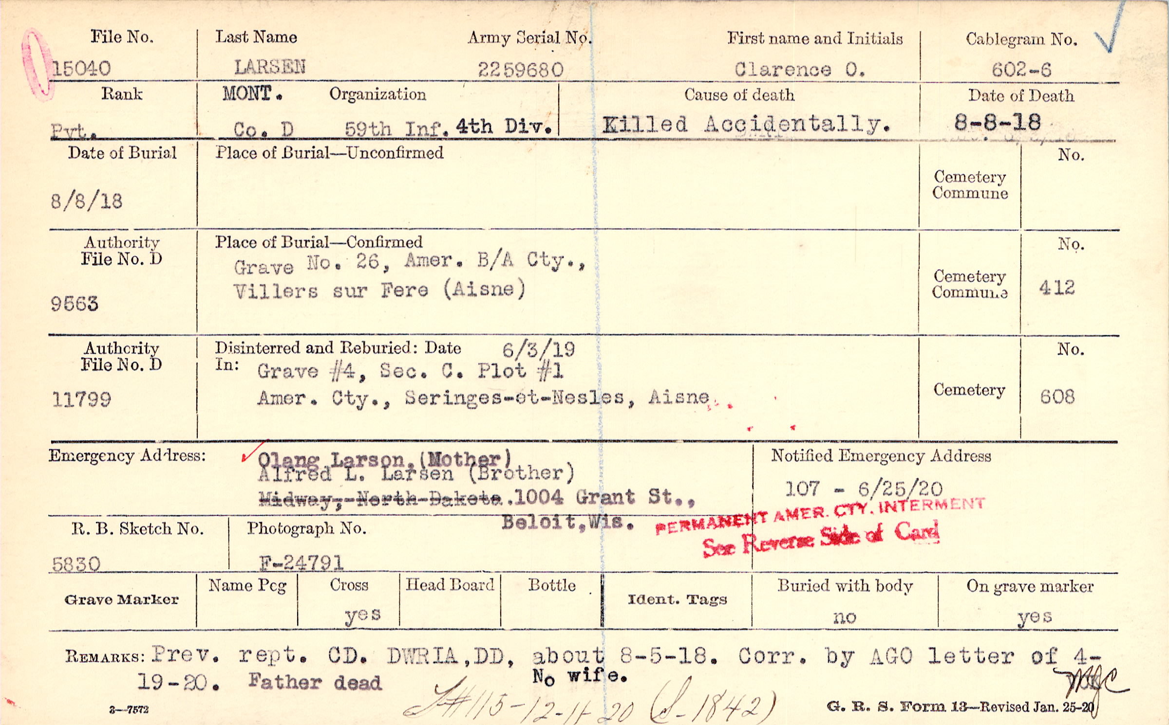 Prev. rept. CD. DWRIA, DD, about 8-5-18. Corr. by AGO letter of 4-19-20. Father dead. No wife., F#115 12-11-20, (S 1842)