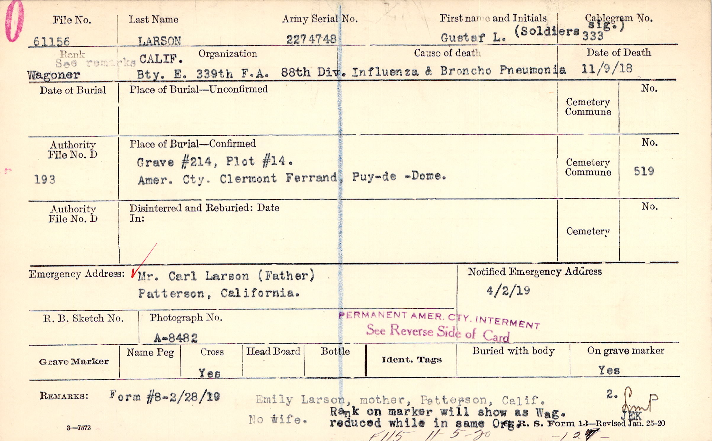 Grave #214, Plot #14, Amer. Cty., Clermont Ferrand, Puy-de-Dome