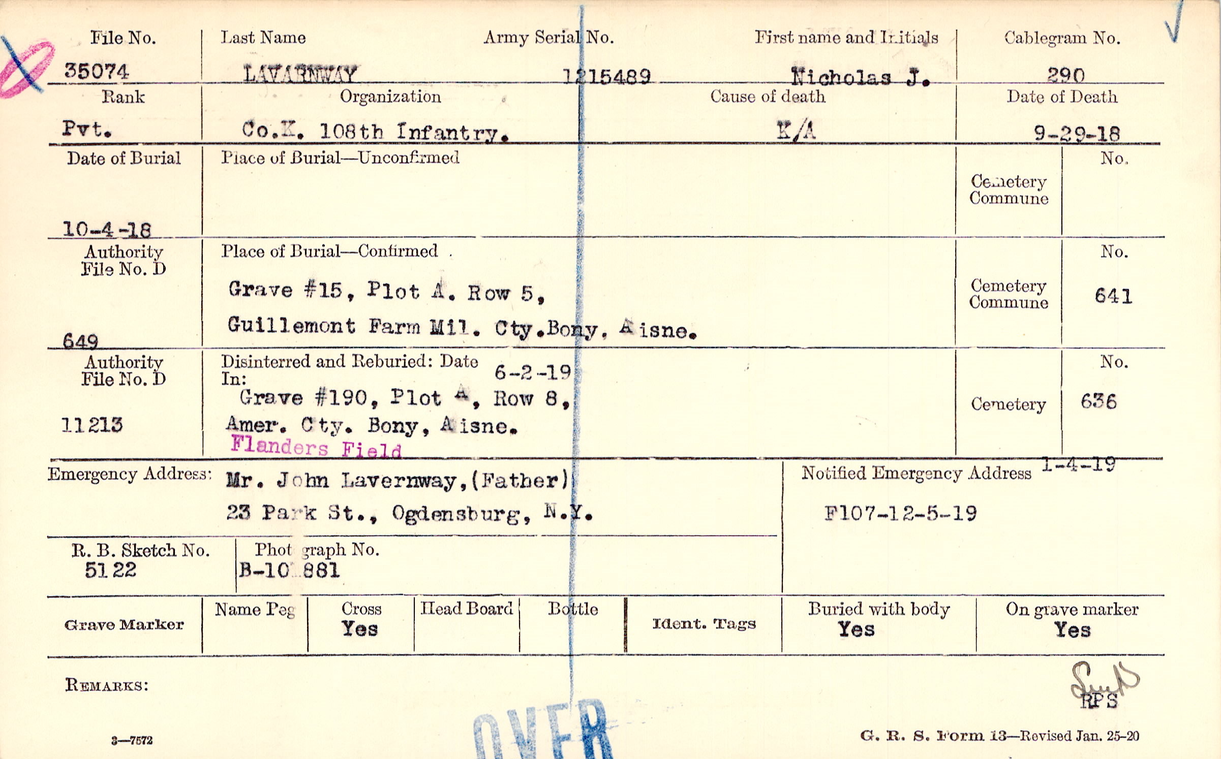 Mr. John Lavernway, (Father), 23 Park St., Ogdensburg, N.Y.