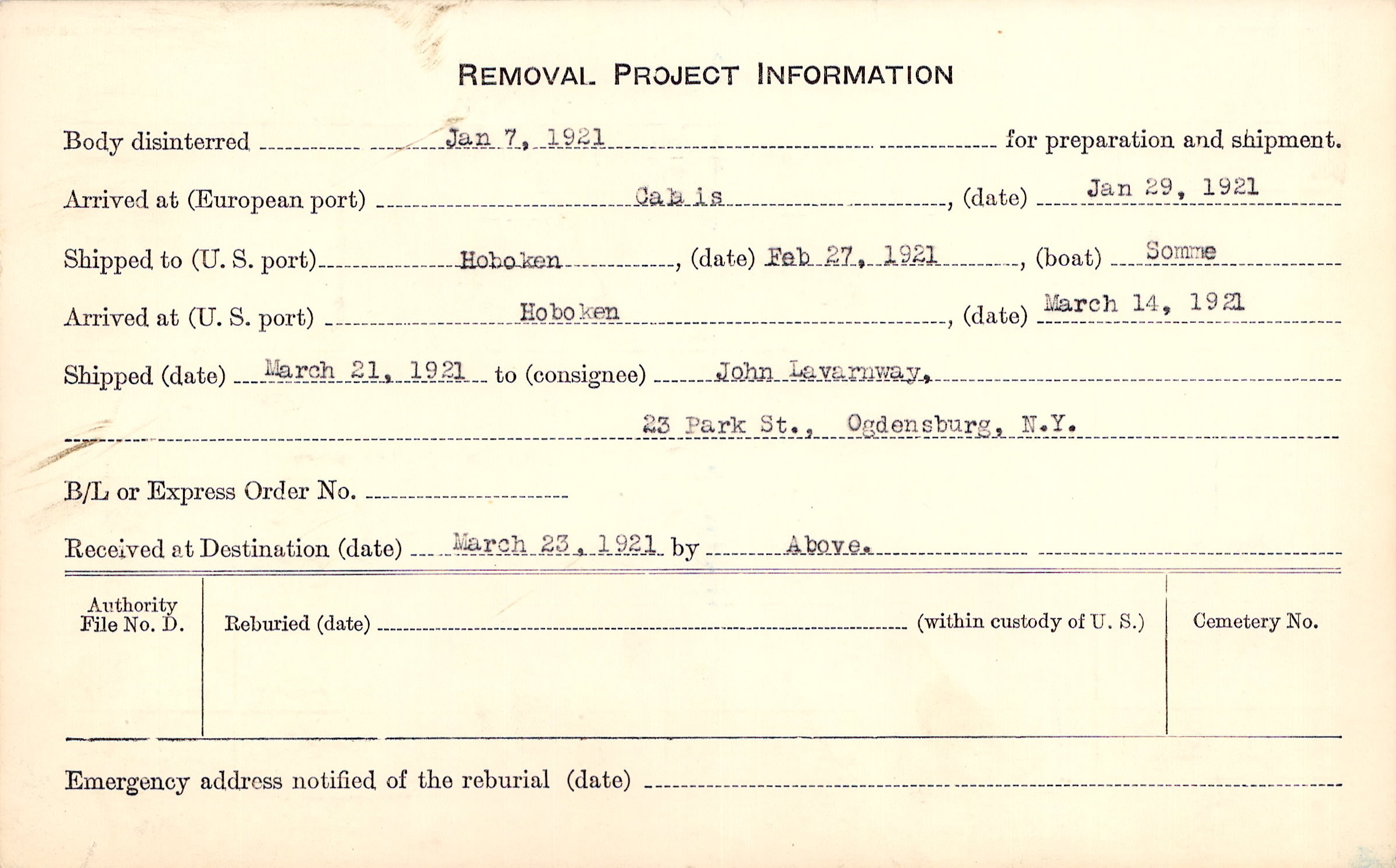 Body disinterred 1/7/1921 for preparation and shipment.