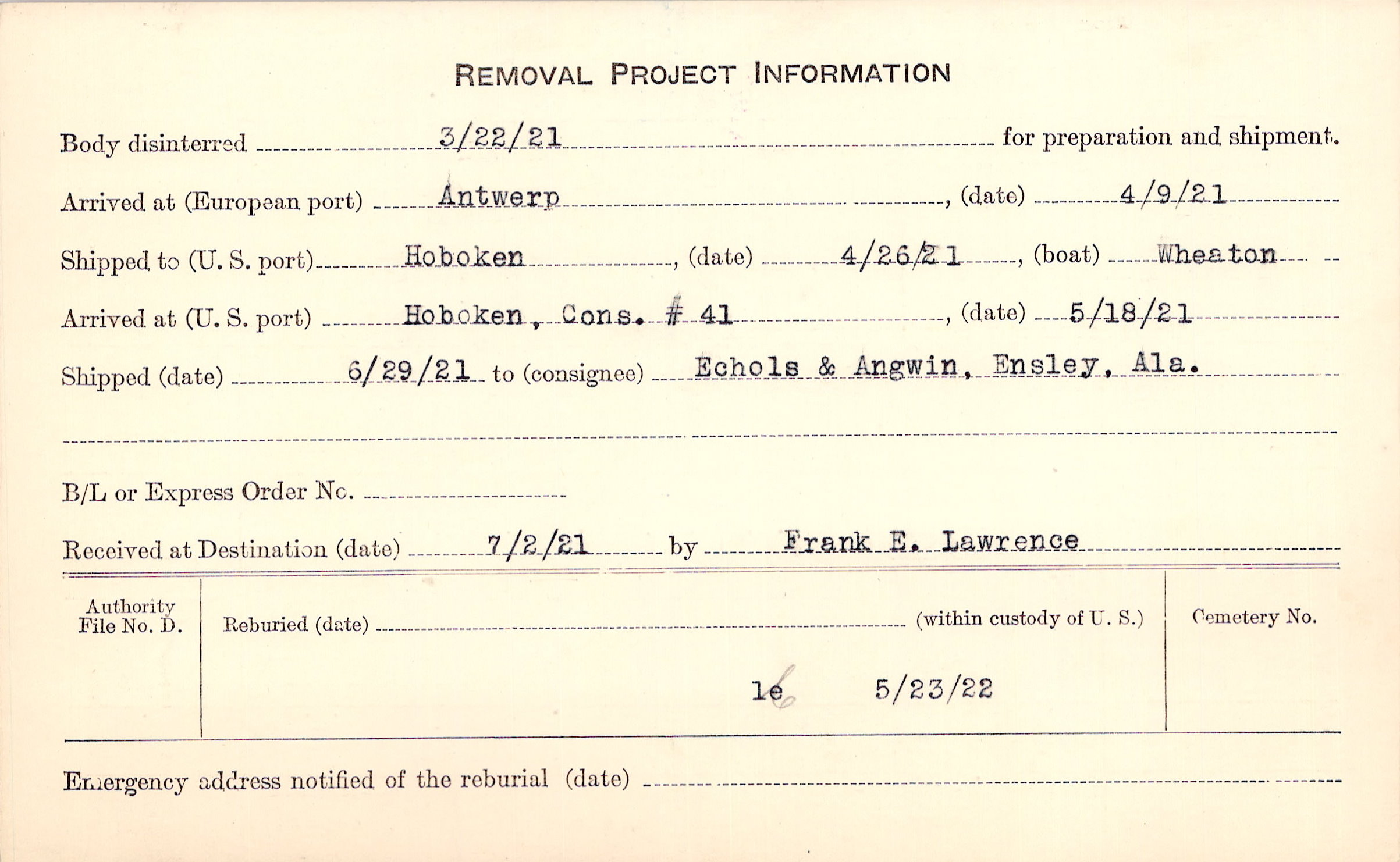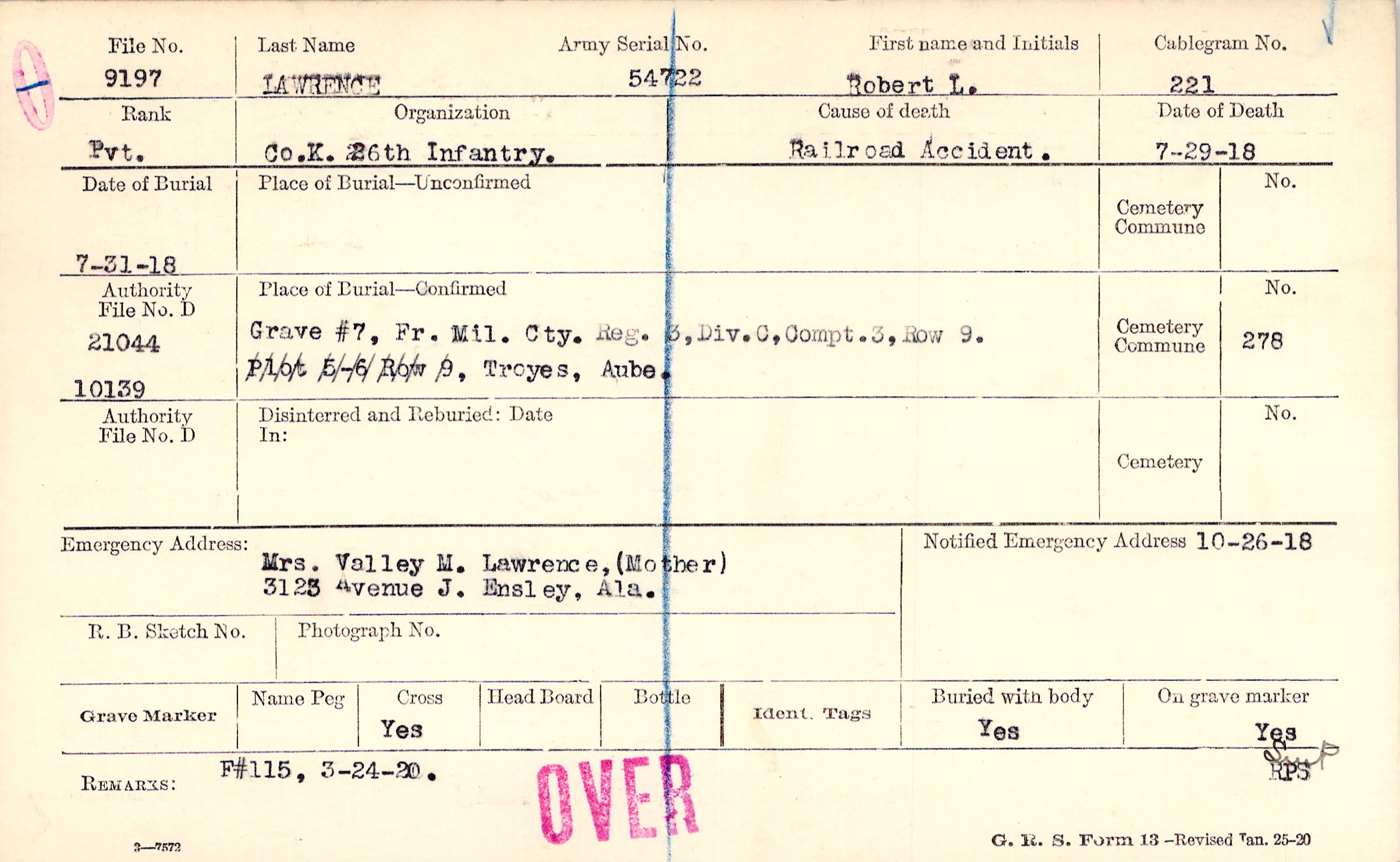 Mrs. Valley M. Lawrence, (Mother), 3123 Avenue J. Ensley, Ala.