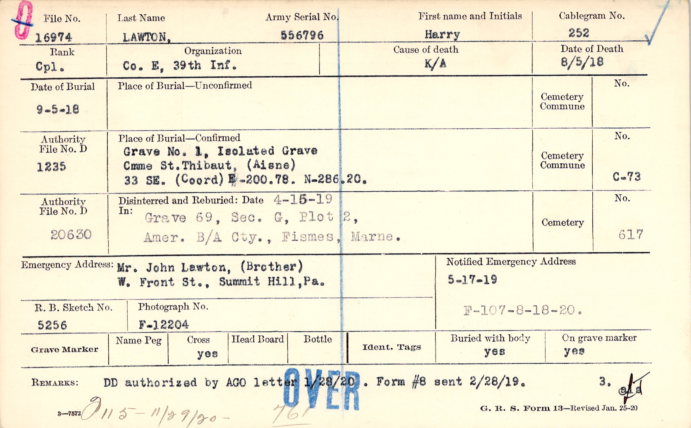 Mr. John Lawton, (Brother), W. Front St., Summit Hill, Pa.