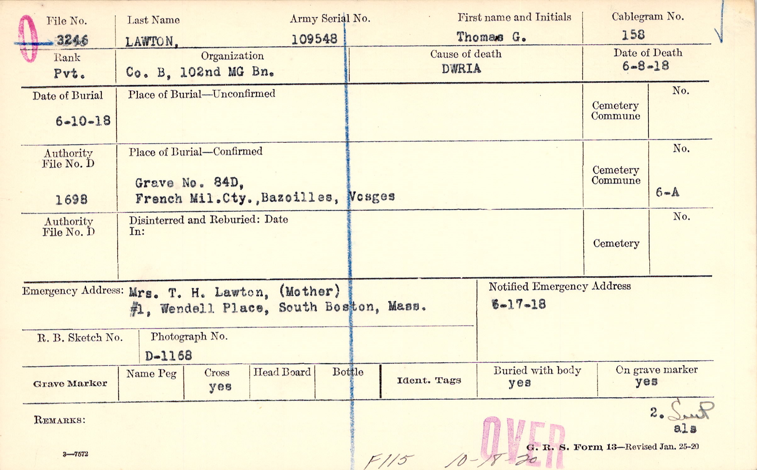 Mrs. T. H. Lawton, (Mother), #1, Wendell Place, South Boston, Mass.