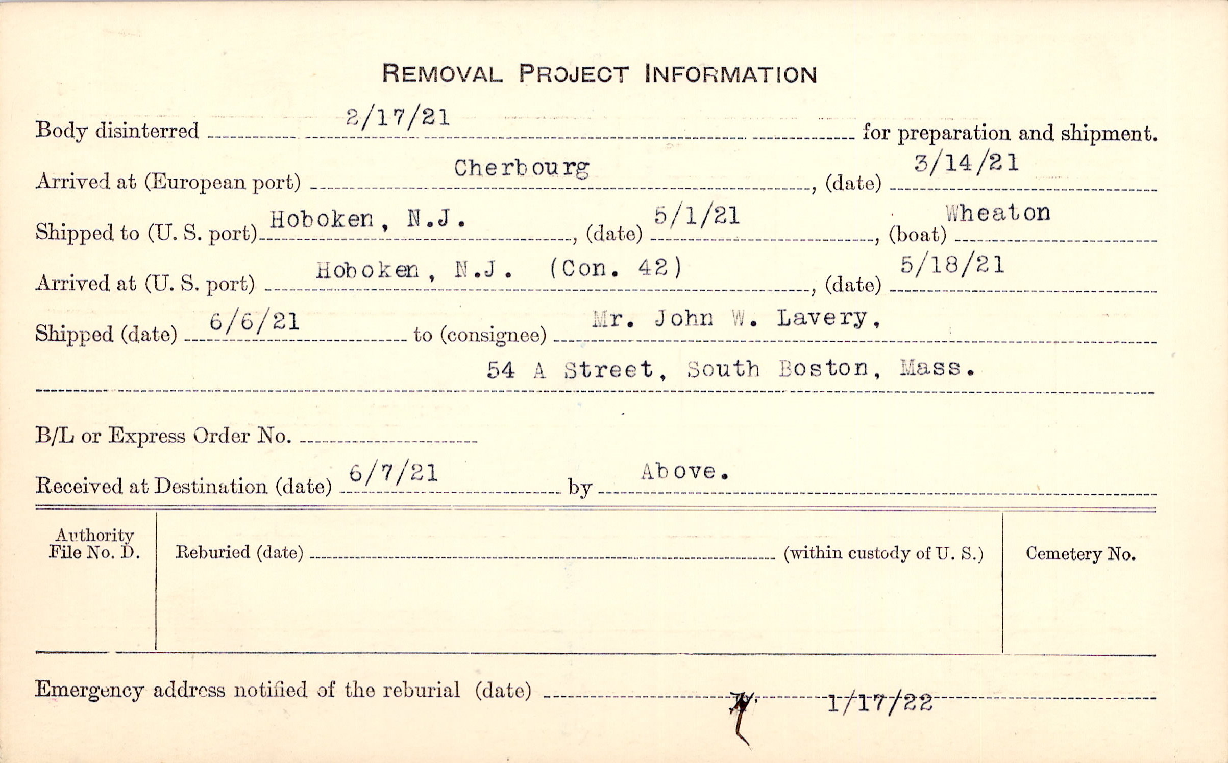 Body disinterred 2/17/1921 for preparation and shipment.